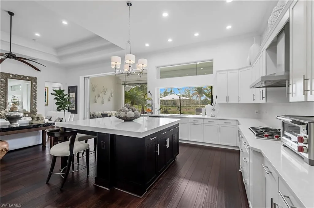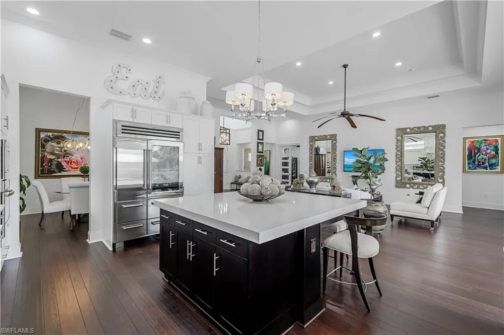 As you step inside, you’re greeted by soaring ceilings and an open floor plan. The 10’ pocketing impact sliding doors and pocketing kitchen window create a seamless transition between indoor and outdoor living. The dream kitchen is a culinary enthusiast’s haven, featuring a Wolf gas cooktop, a Sub-Zero refrigerator, and a spacious island perfect for meal prep and entertaining.