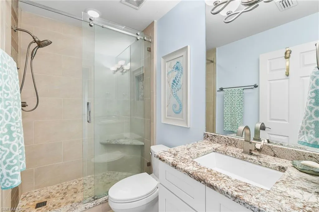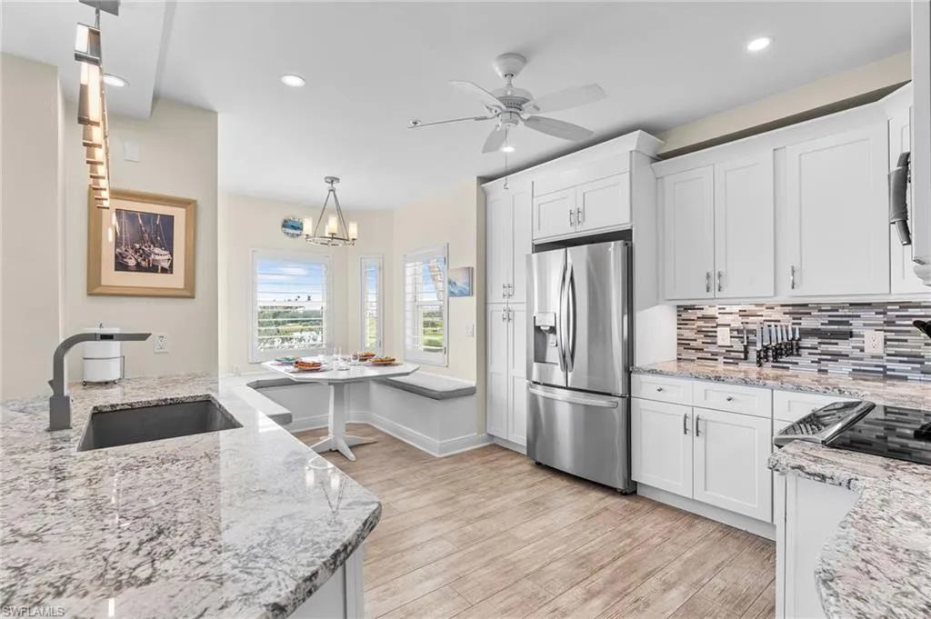 Beautiful Waterside 3 bed, 3 bath condominium that has a panoramic view of a large green nature preserve with lots of bird life and a skyline of beachfront condo on the Gulf of Mexico. You can enjoying sitting on the lanai watching the winter sunset skies and a bright natural ambience! This property is being offered turnkey furnished with tasteful modern furnishings! The kitchen has soft touch cabinetry and beautiful polished granite countertops. The large bay windows are tinted to keep the heat out and no need for curtains. The third bedroom has a queen size murphy bed and built in office space for two! It’s the perfect office and spare bedroom. You have storage outside by the packing space and on the 2nd floor for easy convenience. You have one assigned covered parking space. Social room and exercise room are on the first floor. There are also guest suites on the first floor available to rent if the three bedrooms are not enough to handle guests or family. Waterside 1 is the first building as you go through the Guard Gate AC 2025 Electric panel 2024