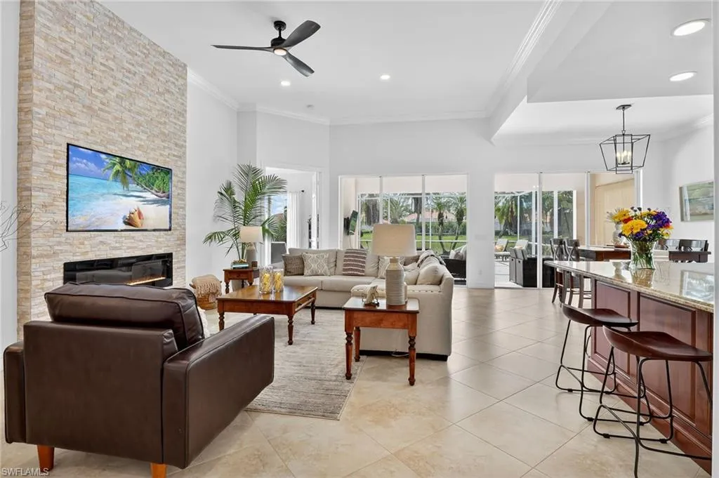 The spacious Great Room is filled with natural light and centers around a custom electric fireplace, creating a warm and inviting atmosphere.