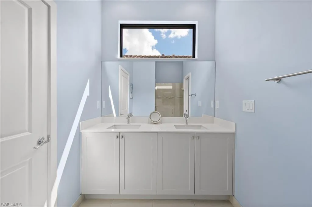 Inside, an expansive open floor plan showcases designer finishes, abundant natural light, and serene views of the lush preserve beyond the fenced backyard. The chef’s kitchen is appointed with crisp white cabinetry, gleaming quartz countertops, stainless steel appliances, abundant storage and pendant lighting over the oversized peninsula—perfect for gathering with family and friends. The adjoining dining and living spaces flow seamlessly to the outdoors, where a private backyard retreat offers tranquility and space to relax or entertain. Upstairs, a custom-built wet bar elevates the versatile loft, ideal for hosting or unwinding. Additional bedrooms upstairs offer guests privacy and comfort, perfect for hosting or multi-generational living. The downstairs primary suite is a haven of luxury, featuring a spacious layout, spa-like bath with dual sinks and walk-in shower, and generous closet space.