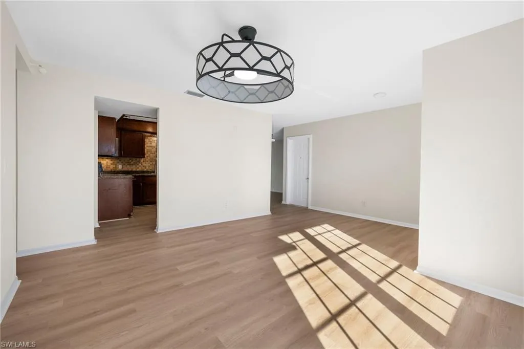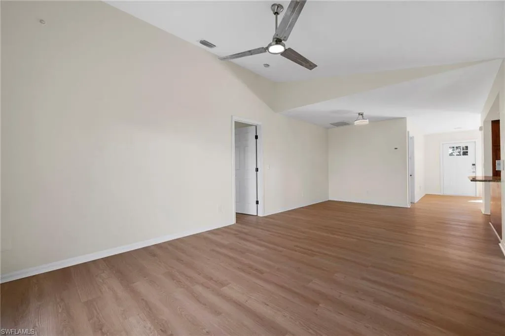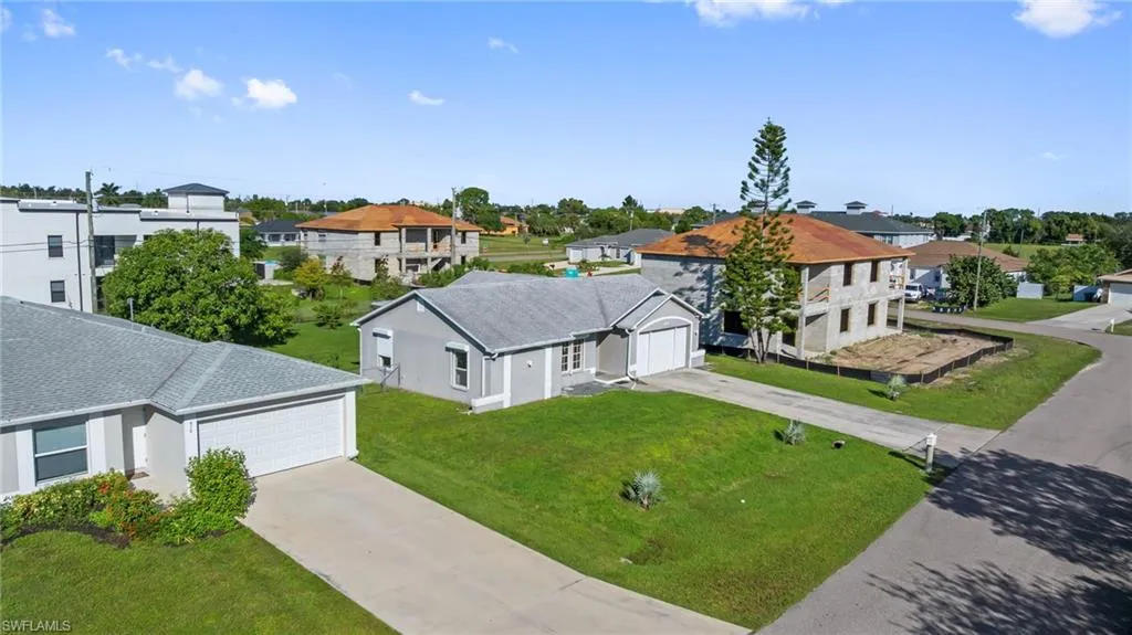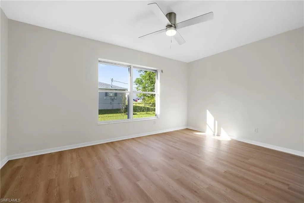 This beautiful 3-bedroom PLUS a den, 2-bathroom home is located in the desirable SW Cape Coral area. Step inside to find new luxury vinyl flooring and fresh paint throughout, complementing the nicely appointed kitchen and the two BRAND NEW completely renovated bathrooms. The spacious master bedroom features an ensuite with a walk-in shower and a large walk-in closet. The guest rooms are separate from the master suite offering privacy for all. The large den is perfect for a home office or could be used as a second living area or even a 4th bedroom for those needing extra space. A newly installed impact slider was just installed offering easy access to the backyard. Block Construction, a Higher Base Elevation, and Permanent Roll Down Hurricane Shutters installed on all of the windows offer great peace of mind. Schedule your private showing today !