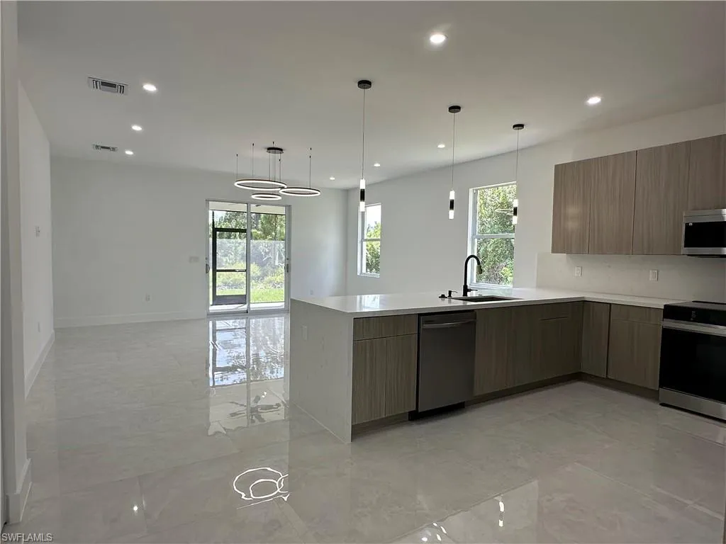 Modern New Construction Home – Move-In Ready! Step into this beautifully designed 4 bedroom, 3 bathroom, 2-car garage home, perfectly blending modern finishes with functional living. Bright open-concept layout with high ceilings and recessed lighting. Stunning porcelain tile floors throughout the entire home. Gourmet kitchen with sleek white cabinetry, quartz countertops, island seating, and modern pendant lighting. Stainless steel appliances and matte black fixtures for a sophisticated touch. Spacious living and dining area with sliding glass doors leading to the backyard. Elegant bathrooms with floor-to-ceiling tile showers, frameless glass doors, and floating vanities. Laundry closet with hookups conveniently located inside. Long driveway with plenty of parking. Screened-in lanai overlooking the spacious backyard, ideal for relaxing or entertaining. Impact-resistant windows and doors for peace of mind. this Home is Nestled in a quiet and growing neighborhood and offers easy access to shopping, dining, schools, and major roadways. Enjoy modern living in a serene setting while staying close to all conveniences. Perfect for families, first-time buyers, or as an investment property.