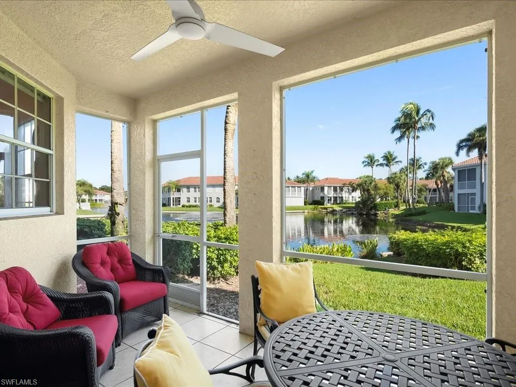 WOW! THIS HAS IT ALL! BEAUTIFUL LAKE VIEW, SCREENED LANAI,ONE CAR GARAGE, HIGH CEILINGS ,FIRST FLOOR This beautifully furnished 2-bedroom condo in the private, gated community of L’Ambiance at Pelican Bay offers tranquil lake views with a cascading water feature. Inside, you’ll find a light-filled, open layout with split bedrooms for privacy. The spacious living room flows to a dining area and upgraded eat-in kitchen, while the screened lanai invites you to relax or dine al fresco with a 180° view of the lake and waterfall. The primary suite features generous closets, a tub and shower bath, plus space for a private desk. The guest suite boasts a Jack and Jill bath. A one-car garage and private driveway add convenience.