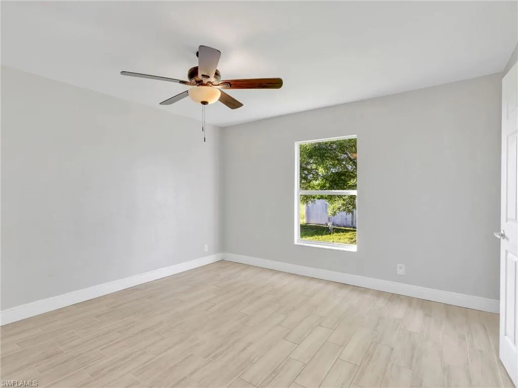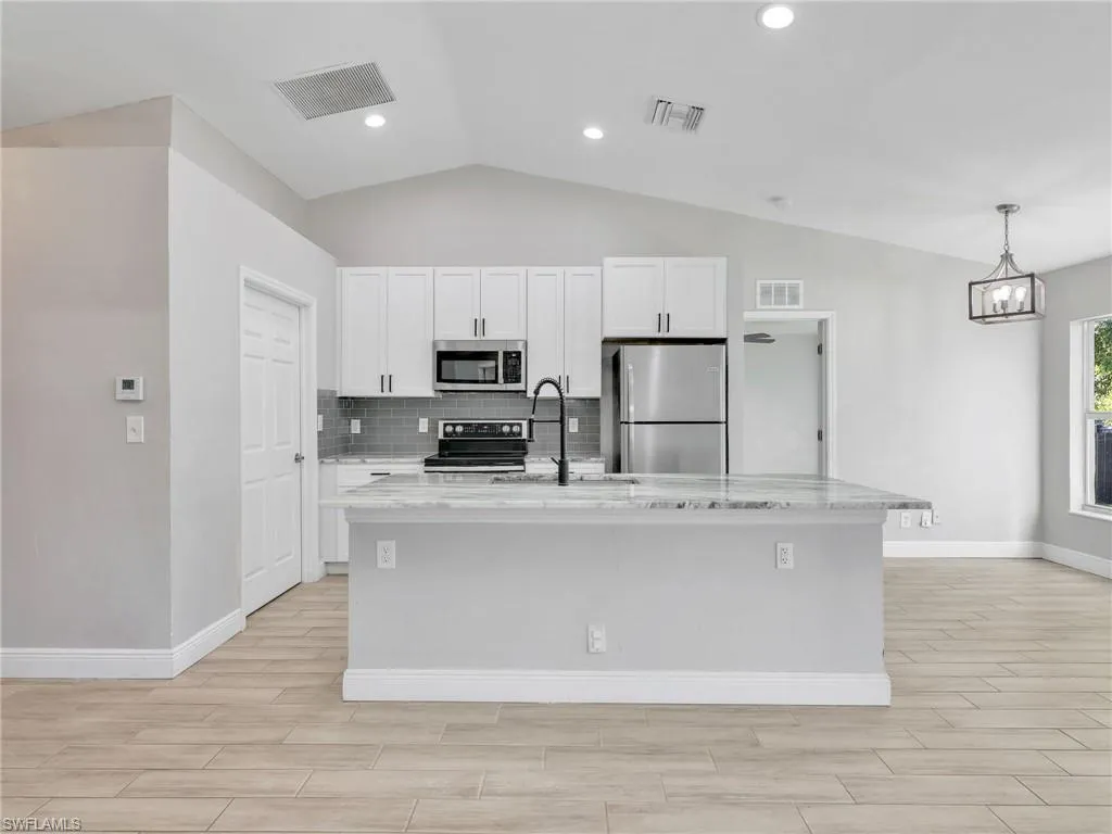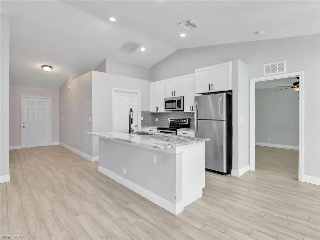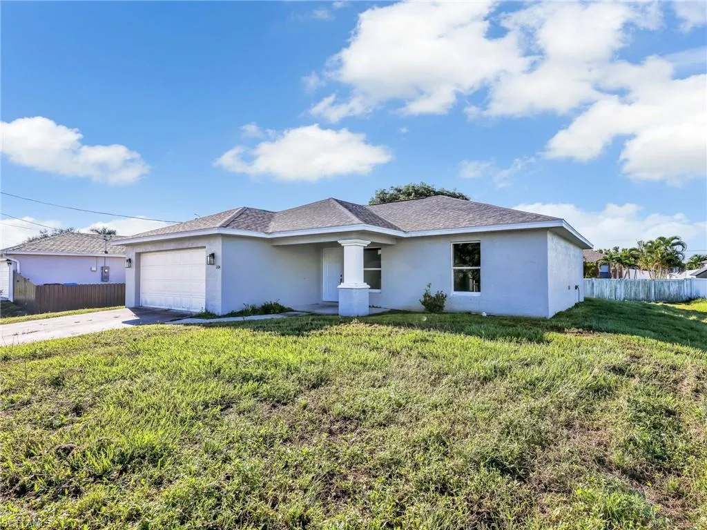 This 3-bedroom, 2-bath home in Cape Coral offers a bright and inviting open floor plan with volume ceilings and plenty of natural light. The spacious family room features large sliders that open to a generous screened lanai, overlooking a wide stretch of green space perfect for kids and pets. The kitchen is equipped with stainless steel appliances, a walk-in pantry, breakfast bar, and dining area, making it ideal for both everyday living and entertaining. The split floor plan provides privacy, while tile flooring throughout, recessed lighting, ceiling fans, and neutral paint create a clean and modern feel. With ample closet space and a 2-car garage, this home combines comfort and convenience in a desirable location close to shopping, dining, and entertainment options. Families will appreciate its close proximity to schools.