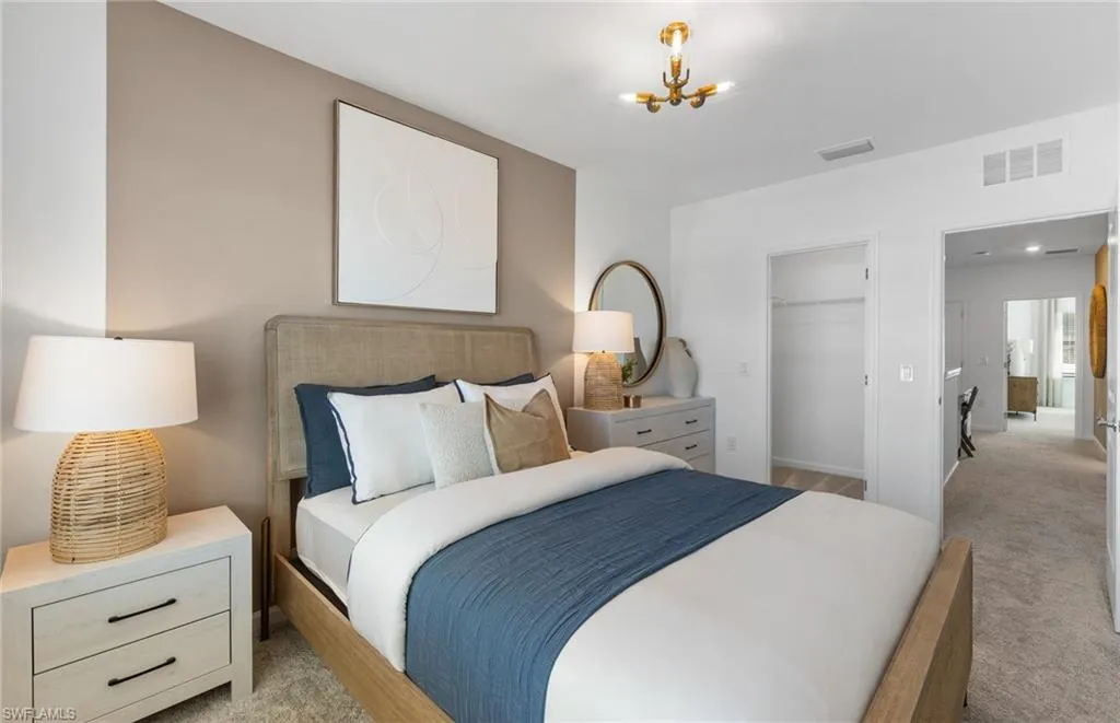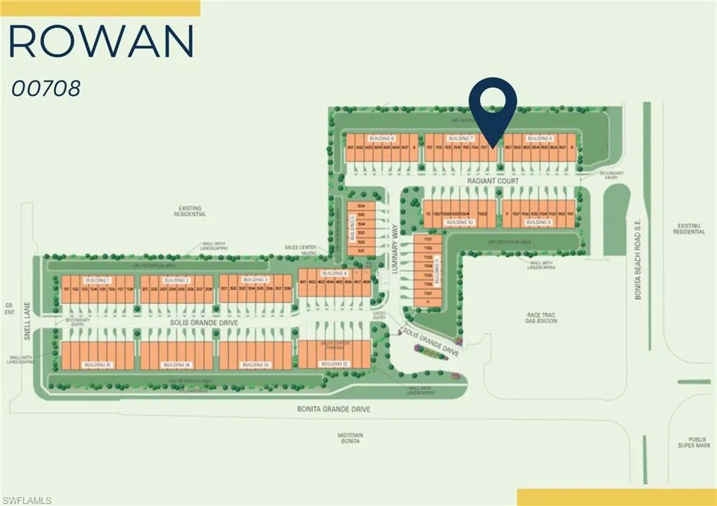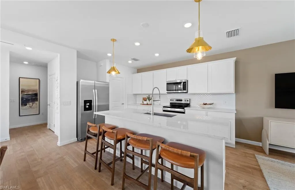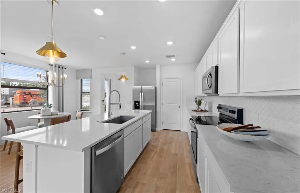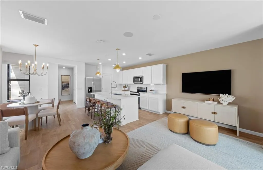 Discover the Rowan, a beautifully designed townhome offering 3 bedrooms, 2.5 bathrooms, and a 2-car garage. Stylish upgrades include 6×24 tile flooring on the main level, cozy carpet upstairs, white cabinetry with quartz countertops, and a smart home package for modern living. Built with durability and peace of mind in mind, this home also features a tile roof and impact glass throughout. Located in Solis Grande, a gated new townhome community with 118 future residences, residents will enjoy low-maintenance living with no CDD fees. Perfectly situated in Bonita Springs, Solis Grande offers convenient access to shopping, dining, and entertainment—plus it’s just 7 miles to the beach!