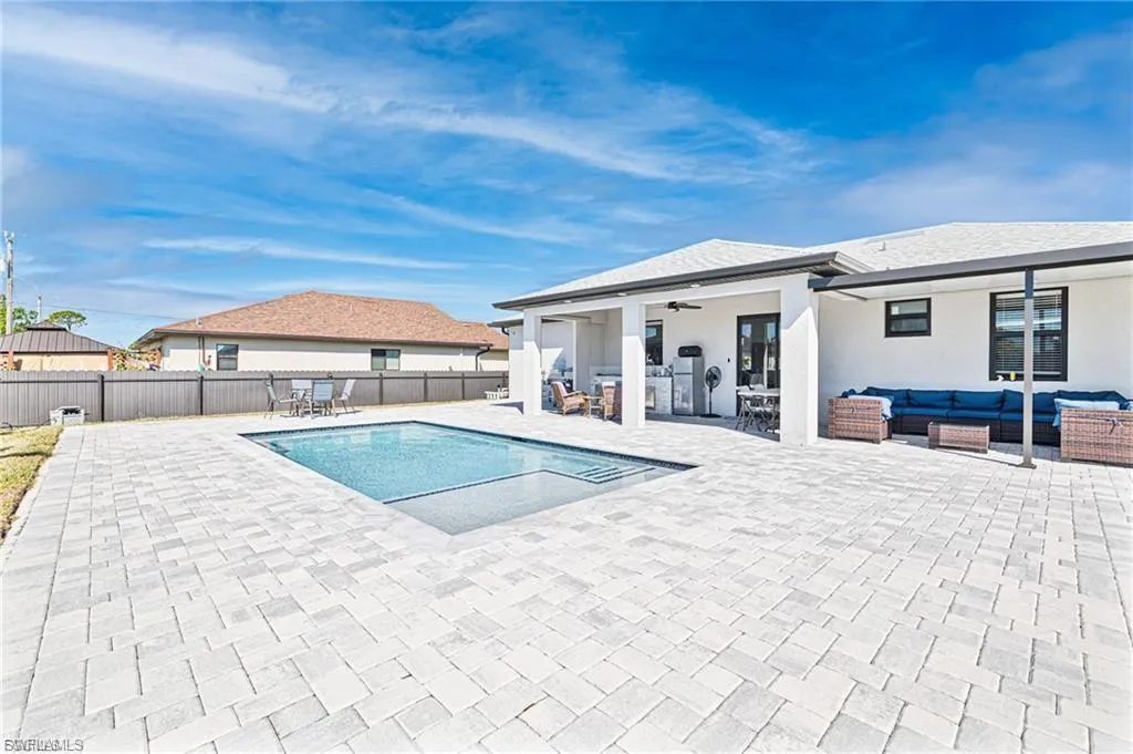 This stunning, newly built residence combines modern design with luxury details and is located in a quiet area of ??Cape Coral. The property features 3 spacious bedrooms and 2 full bathrooms, offering comfortable and functional spaces for daily living. Upon entering, you will be greeted by an open concept with quartz countertops in the kitchen and bathrooms, complemented by high-quality finishes. Impact-resistant windows and doors ensure safety and energy efficiency, while natural light fills every corner of the home. The double garage offers ample space For vehicles and additional storage. The outdoor area is a true oasis. The recently built swimming pool invites you to enjoy moments of relaxation, while the terrace with a modern-style pergola creates the perfect environment for outdoor entertaining. The fully equipped outdoor kitchen is ideal for family gatherings or dinners under the open sky. This property is the perfect balance between elegance, comfort and modernity. A true gem in the heart of Cape Coral!