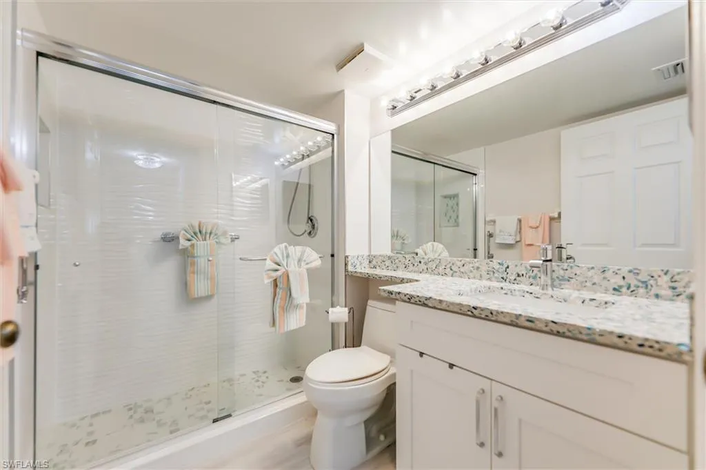 Updated master shower with modern tile; second bathroom also features Bretagne Vetrazzo finishes.