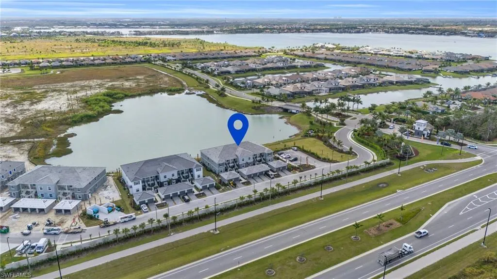 Enjoy amazing wide water views and southern exposure from this bright and airy 2nd-floor end unit in Esplanade Lake Club. With 2 bedrooms, a den, 2 bathrooms, and a detached 1-car garage, this condo has everything you need for full-time living or a seasonal lock-and-go retreat. The open-concept layout makes everyday living a breeze, with a modern kitchen featuring stainless steel appliances, quartz countertops, white cabinets, and a large island perfect for entertaining. Beautiful plank tile flows throughout the main living areas, and the versatile den can easily be used as a home office, study, or extra guest space. Esplanade Lake Club is a resort-style community with amenities that feel like a vacation every day: a private lakefront beach, resort pool with cabanas, spa and fitness center, bocce, pickleball and tennis courts, dining at the cabana bar & grill or café, plus a full social calendar. Dog owners will love the large and small dog parks, and outdoor enthusiasts can kayak or paddleboard right on the lake. Conveniently located near I-75, RSW Airport, Gulf Coast Town Center, and plenty of dining and shopping options. This condo truly offers the perfect Florida lifestyle—relax, play, and enjoy the views!
