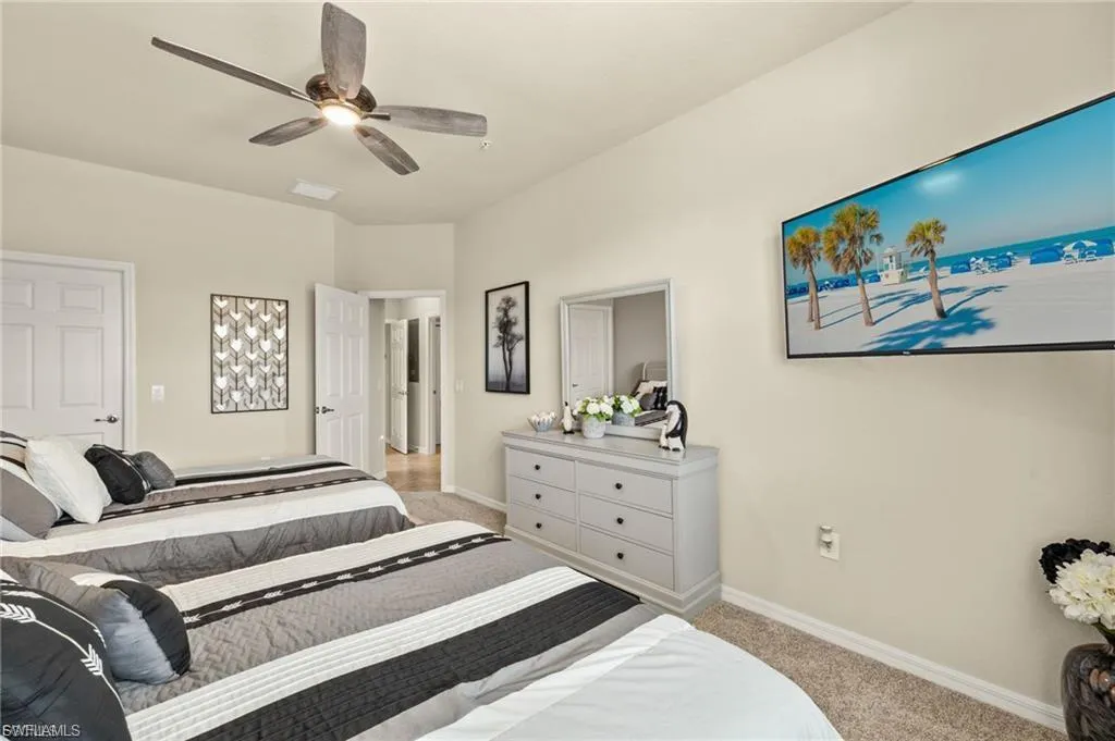 COME SEE THIS “WOW” COACH HOME!! This is an impressive second floor, 3 bedroom/2 bath/2 car oversized garage condo with a big lanai and sweeping sunset views. What enjoyable evenings you will have sitting on your west rear facing lanai watching our gorgeous Florida sunsets! Beautifully furnished and decorated with 3 big bedrooms – Located in Bonita National Golf & Country Club – Social Membership includes all amenities except golf. (Golf is available May through November/off season for Social memberships). Being sold Turnkey/everything included and golf cart is negotiable. This condo is very well stocked from kitchen to bathrooms and everything in between! Current owner has contacts for past renters if new owner is interested. Plenty of storage space: walk-in closets in all 3 bedrooms plus three extra storage closets and the oversize 2 car garage gives plenty of room for bike storage, 2nd refrigerator, etc. Walking distance to the clubhouse with amazing amenities: gorgeous resort style pool – poolside bar and grill – state of the art workout facility – formal & veranda dining – tennis – plus “coming soon” pickleball & bocce ball! – Utopia skin, nails, & massage spa. The LOCATION is really perfect! Just ten miles straight down Bonita Beach Road lands you in the sand and surf at Barefoot/Bonita Beach. Plenty of places to eat, drink, or get ice cream along Bonita Beach Road! Those ten miles inland get you out of the heavy traffic congestion and no flooding worries. Just 5 miles to Publix grocery and within 20 miles of Fort Myers International Airport, Downtown Fort Myers Beach, and Naples.