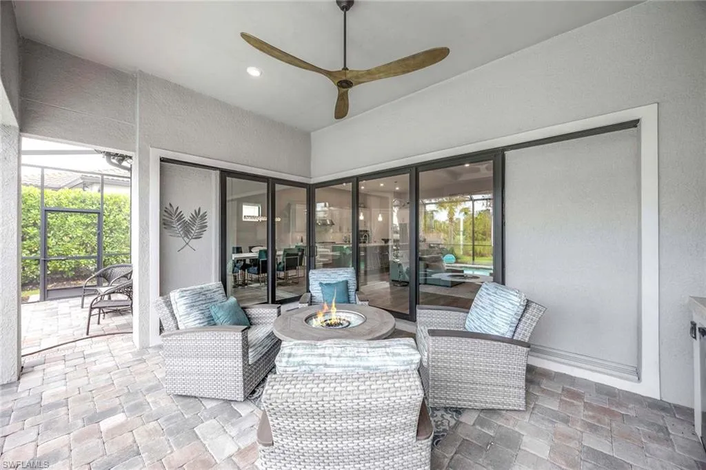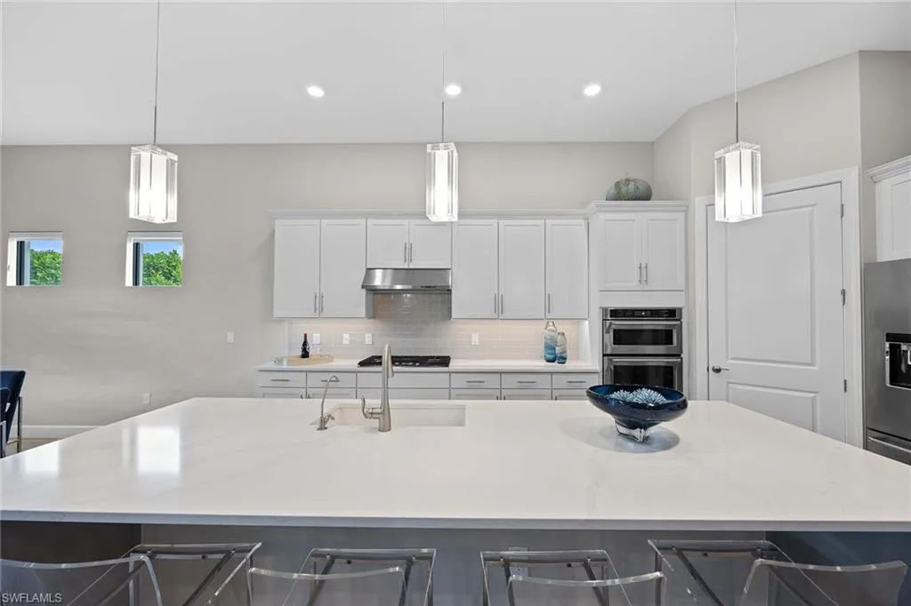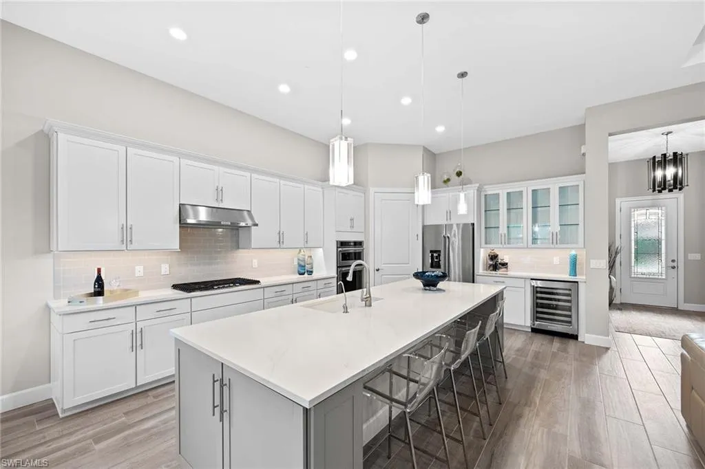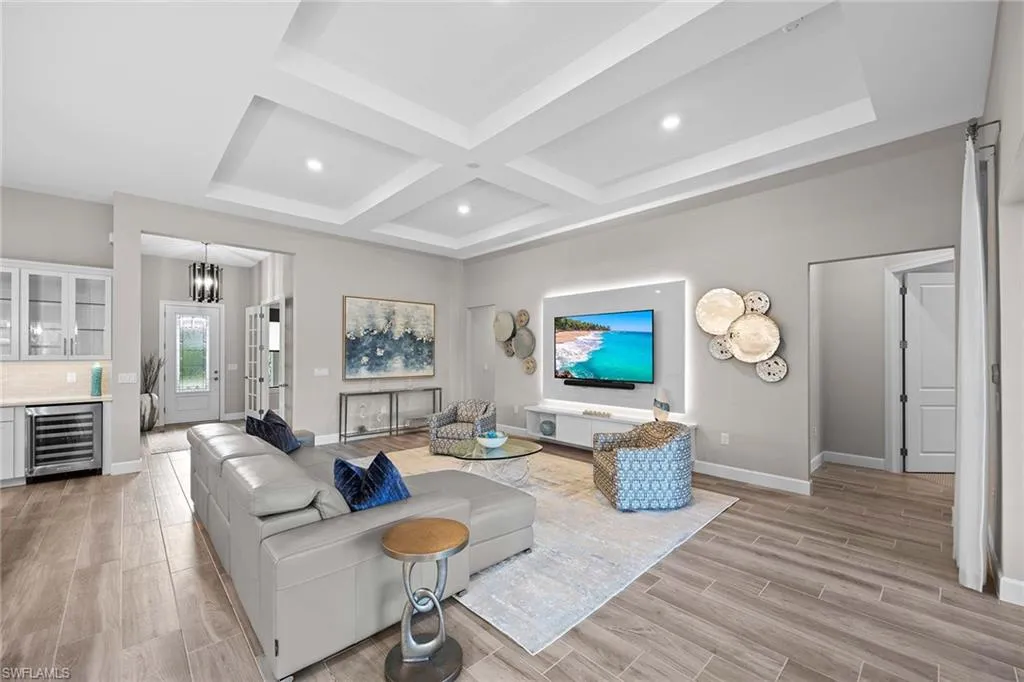 A spacious great room with a backlit entertainment wall and coffered ceiling opens to the dining area and gourmet kitchen. Designed for both function and style, the kitchen features quartz countertops, a tile backsplash, custom cabinetry and premium KitchenAid appliances, including a natural gas cooktop and wine bar upgrade with built in cooler. Zero-corner sliders extend the open-concept layout onto a covered lanai with an outdoor kitchen with grill, refrigerator and TV, dining space and lounge area with fire table, all overlooking a screened paver patio with a heated pool, spa and fire pit.