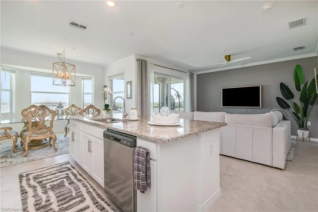 Perched on the tranquil edge of Lake Babcock, this top-floor unit features an expansive western exposure, offering some of the most breathtaking sunset views in all of Babcock Ranch—best enjoyed from your private lanai. Step inside to an inviting open-concept floor plan designed for effortless entertaining and relaxed everyday living. The kitchen has an large island, perfect for casual meals and social gatherings, in addition to a separate small dining area. The decorative upgraded kitchen backsplash adds a sleek and modern flair.