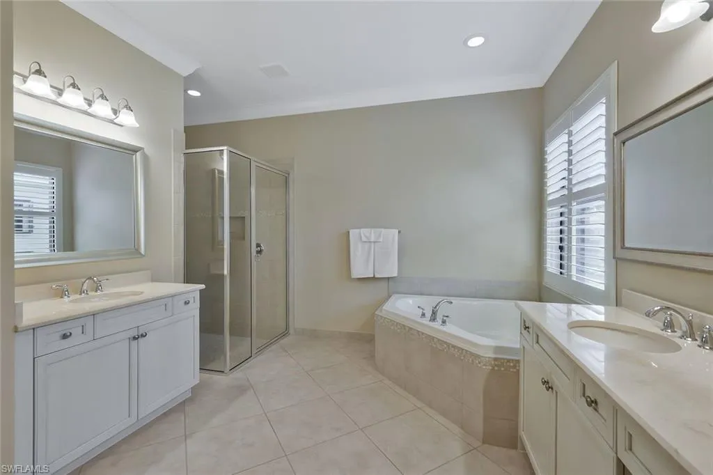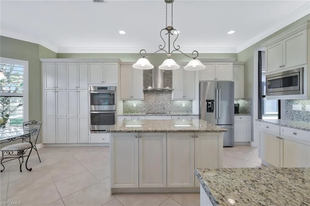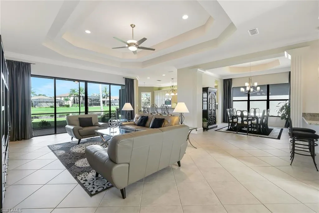 Sunsets over the lake and timeless elegance define this coveted 3,051 sq. ft. Carlyle, the most sought-after floor plan in Riverstone. Beyond the gated courtyard, double entry doors reveal an inviting layout designed for both easy everyday living and effortless entertaining. A spacious great room, formal dining room, wet bar with KitchenAid beverage fridge, and an adjacent custom wine storage rack for over 150 bottles make hosting unforgettable evenings a breeze. At the heart of the home, the gourmet kitchen features upgraded off-white shaker cabinetry, granite counters and backsplash, ambient lighting, and stainless-steel appliances including a double wall oven, vented hood over the cooktop, and a newer KitchenAid refrigerator—sure to inspire any culinary enthusiast. The versatile Club Room, finished with wood flooring and matching plantation shutters, is perfect as an office, den, or media retreat. The primary suite offers serene lake views, custom closets, and a spa-like bath with marble counters and decorative mirrors. Two private guest suites, each with a full bath and built-in closets, ensure comfort for family and friends. Thoughtful details include crown molding, wood-wrapped pillars, decorative mantlepiece, upgraded lighting fixtures and fans, and elegant window treatments. Everyday living is made easier with a finished laundry room offering a sink, ample cabinetry, folding counter, and a new (2024) LG washer and dryer. Peace of mind comes with a whole-home Generac generator powered by dual 120-gallon tanks, accordion shutters for quick storm prep, and an AC system with medical-grade UV lights and filters. The garage is equally functional with storage shelving and insulated doors. Expansive glass sliders flow seamlessly to the outdoors, where a west-facing lanai frames tranquil lake views and panoramic sunsets that fill the sky with vibrant color. The backyard offers abundant space to add a custom pool or design your own custom tropical oasis. Here, unforgettable gatherings, quiet moments, and golden sunsets become part of everyday life. Riverstone offers a vibrant, vacation-inspired lifestyle for all ages. Located in North Naples, just minutes from I-75 and zoned for “A”-rated schools, the community features a fitness center, social hall, resort-style pool, lap pool, spa, five lighted tennis courts, outdoor basketball and pickleball, a full indoor basketball court, tot lot, children’s water play area, game room, and an activities coordinator; making it easy to meet new friends. Perfectly suited for entertaining, unwinding, or savoring the view, this home captures the essence of Naples living.