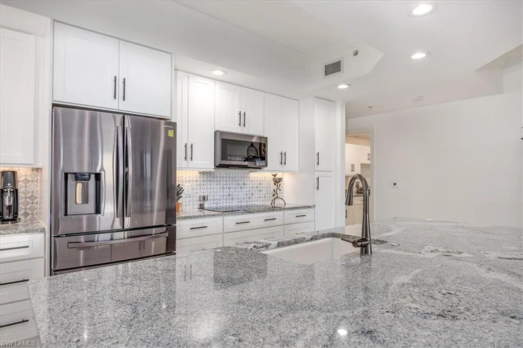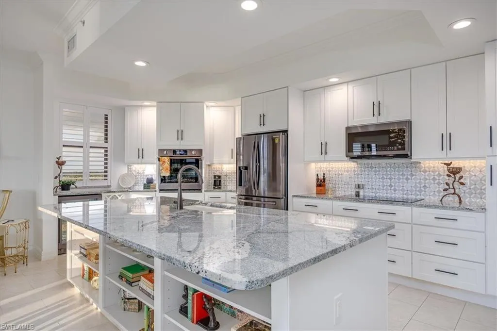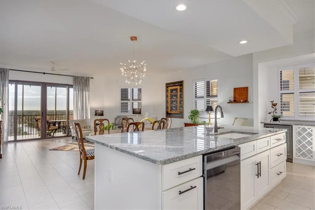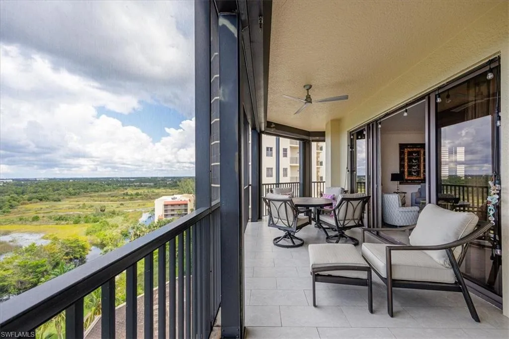 Experience unmatched sophistication and effortless living in this beautifully reimagined residence, perched on the 11th floor of the South Tower at Riva Del Lago. Completely renovated with thoughtful attention to detail, this home showcases sweeping panoramic views of Lakes Park, reaching all the way to the coast. Spectacular sunsets and dazzling nightscapes unfold daily through soaring ceilings, expansive windows, and oversized doors. Every inch of this home has been upgraded—from floor to ceiling—with an emphasis on high design, functionality, and top-tier quality. Elegant porcelain tile flows seamlessly throughout, including the lanai. Soft, refined wall tones, designer wallpaper accents, custom lighting, and mirrors add a sophisticated touch to every space. At the center lies a chef’s dream kitchen, perfect for cooking or entertaining, with custom walnut cabinetry, stone countertops, and a chic patterned backsplash. The open layout enhances the natural light and maximizes the awe-inspiring views. With three spacious bedrooms—including two with ensuite baths—every bathroom features premium fixtures and finishes. The enlarged primary shower and added storage blend luxury with practicality.