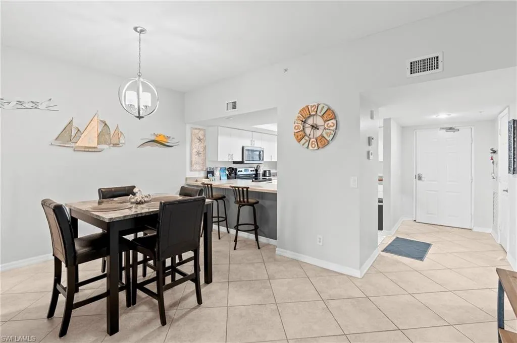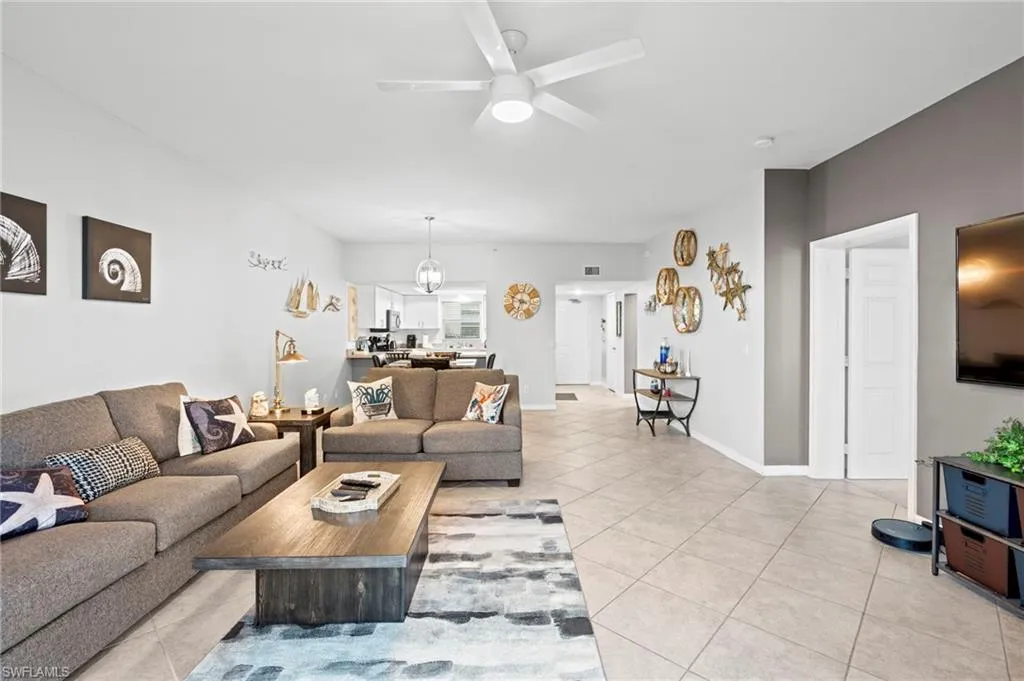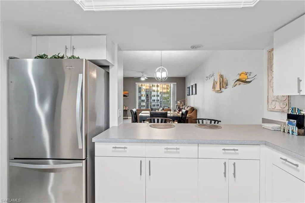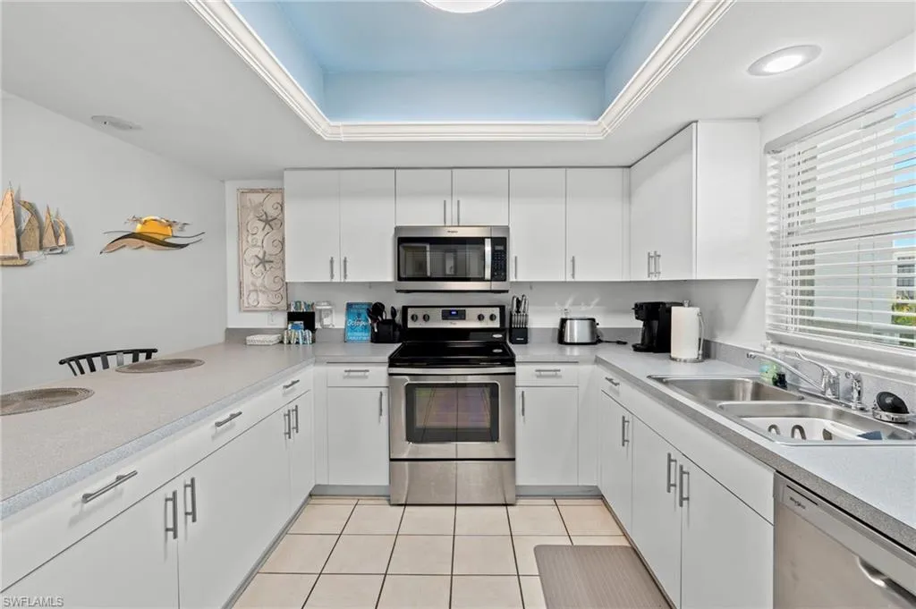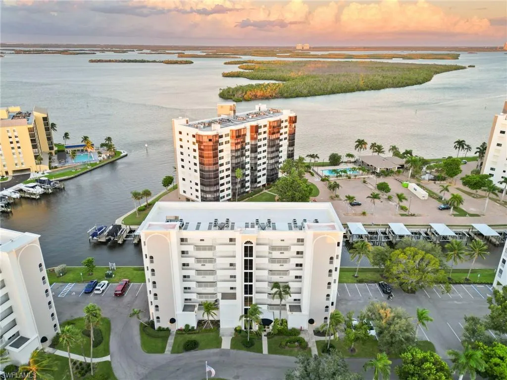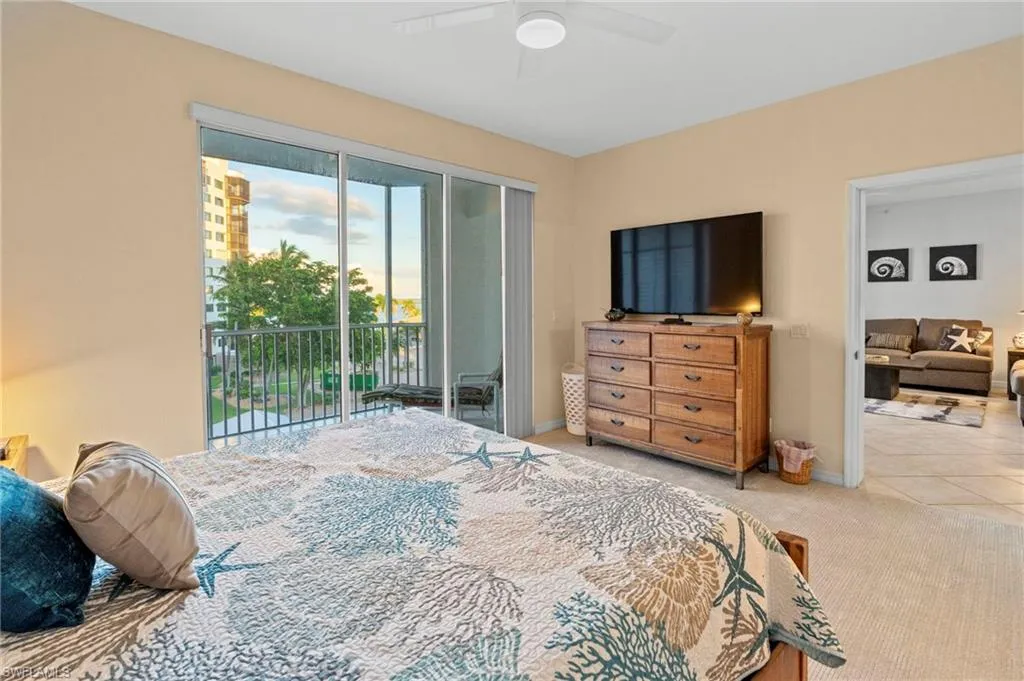 Wake up each morning to breathtaking Bay and canal views from your spacious eastern-exposure screened and tiled lanai. This beautifully maintained condo is being offered turnkey and move-in ready, making it the perfect seasonal home or investment property. With a two-week minimum rental policy, Casa Marina is a highly desirable choice for both owners and investors. Step inside to a large kitchen with plenty of cabinetry, storage, stainless steel appliances, a breakfast bar, and a convenient pass-through window to the dining area. The open living space features contemporary upscale furnishings, including a sofa, loveseat, pub-style dining table, a 70-inch wall-mounted smart TV with Bose sound bar, and modern lighting and fan fixtures. The owner’s suite offers direct lanai access with serene water views, a king-size bed with memory foam mattress, a 60-inch wall-mounted smart TV, walk-in closet, and ensuite bath. A guest bedroom with twin beds and its own walk-in closet provides comfortable accommodations for family or visitors. Additional highlights include a full-size washer and dryer conveniently located on the lanai. Casa Marina Lifestyle: Pool, Deeded beach access, Tennis courts & fishing pier, Preserve, Gulf access-Boat docks available for lease or purchase in the Bay Beach area. Just a 3-minute walk to the beach, with shopping, dining, and the public marina all nearby
