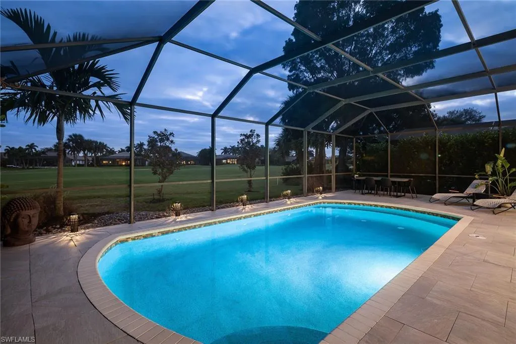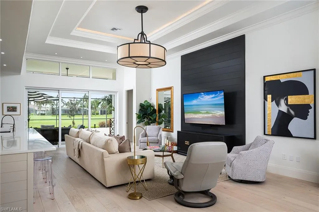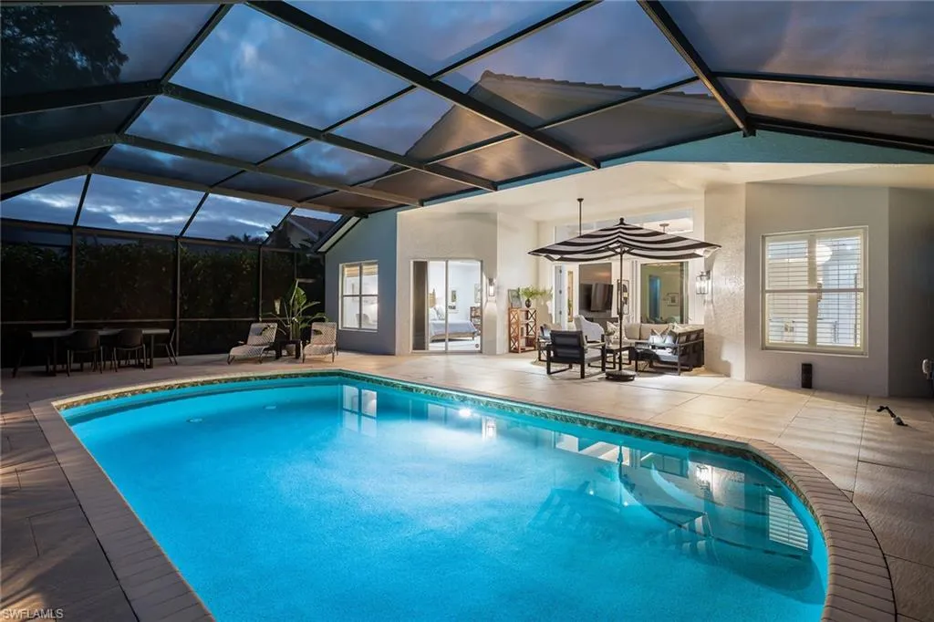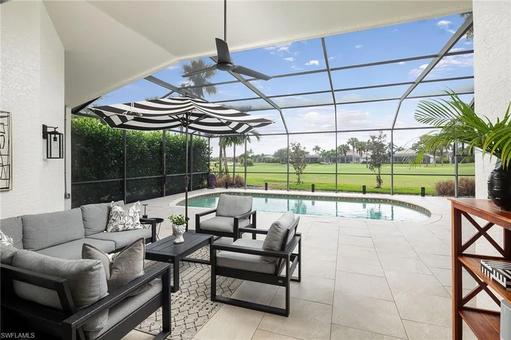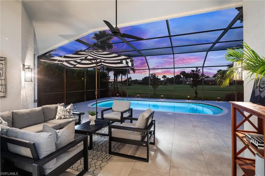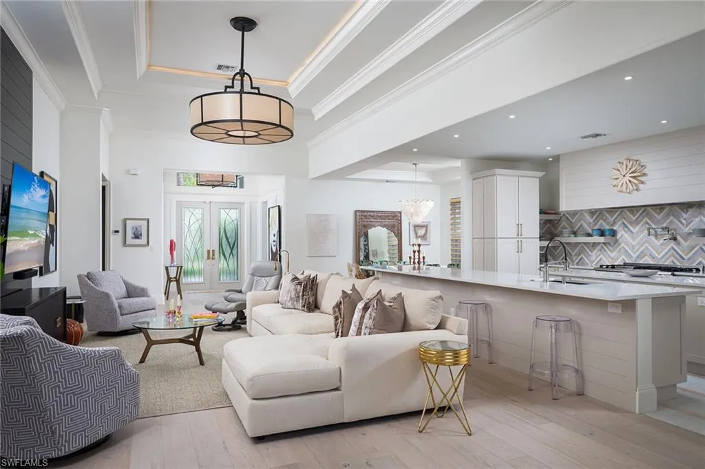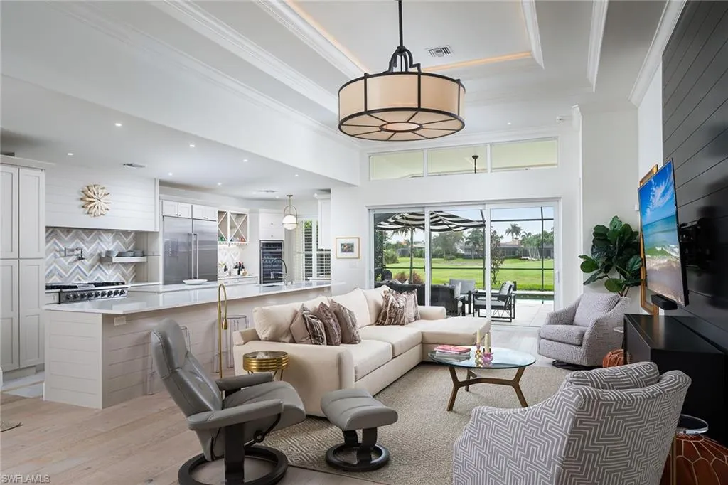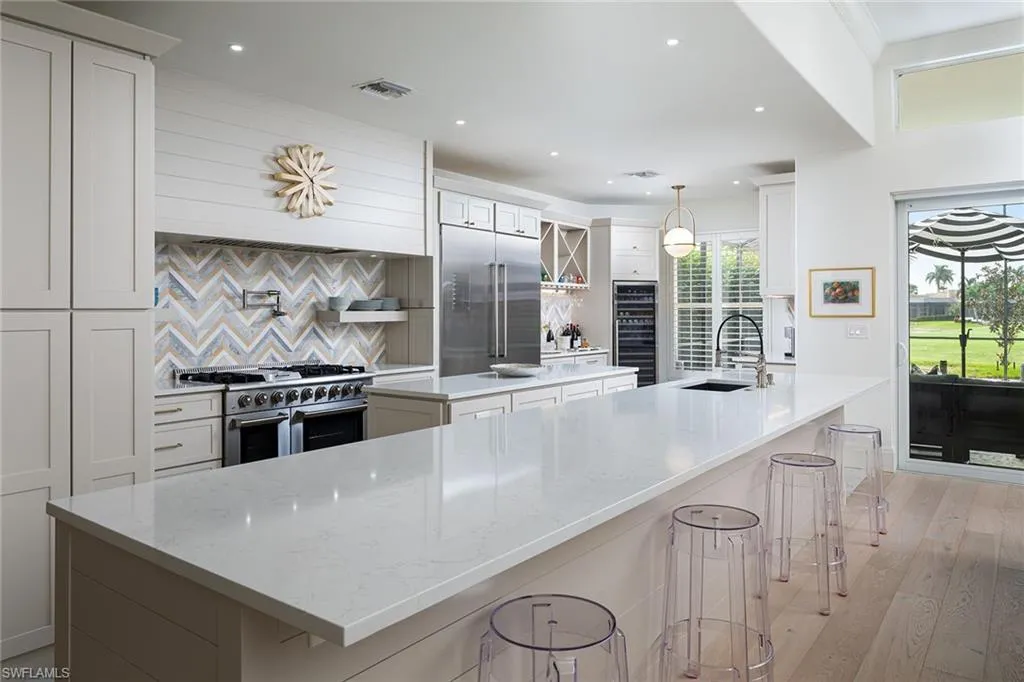 Sophisticated total renovation and redesigned home offered turnkey with fabulous designer furnishings package, all on a prime southern exposure lot with broad golf course and lake views. Immediate full golf membership included. Fabulous cook’s kitchen with huge island with shiplap siding, Thor six-burner gas stove with double oven, Viking refrigerator, full-size wine cooler and icemaker, custom oven hood with shiplap siding, fabulous bar area, ample high-end cabinets with pullout drawers and more. Redesigned primary bath with oversized walk-in shower, large vanity and beautiful wood-framed mirrors. Other improvements include new roof in 2023, new paver driveway in 2023, white oak flooring, stylish chandeliers and lighting package, custom built-in desk and cabinets in the large study easily converted to a third bedroom, plantation shutters, beautiful custom-framed mirrors in the foyer and stylish glass-inlaid double front doors. Wonderful entertaining home with seamless flow to lanai with new stone pool deck and large covered gathering area combined with ample sunning area on pool deck. Naples Lakes Country Club is a sought-after bundled golf community that includes immediate full golf privileges, and active social and sports lifestyle.