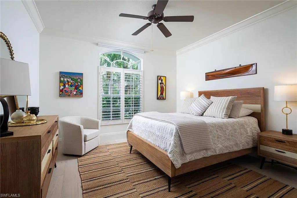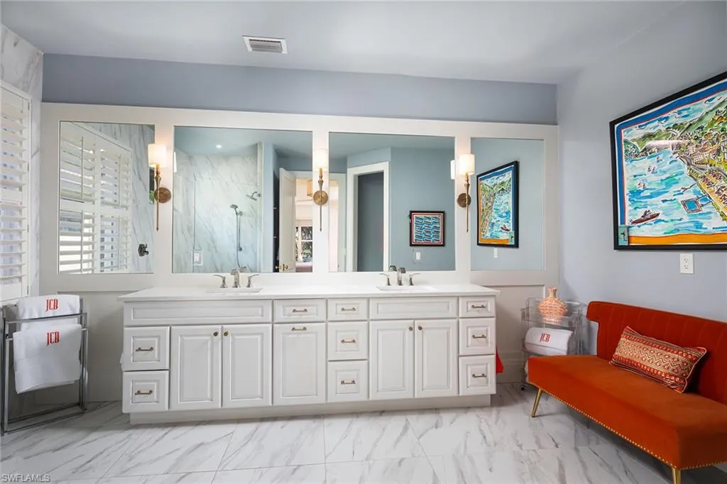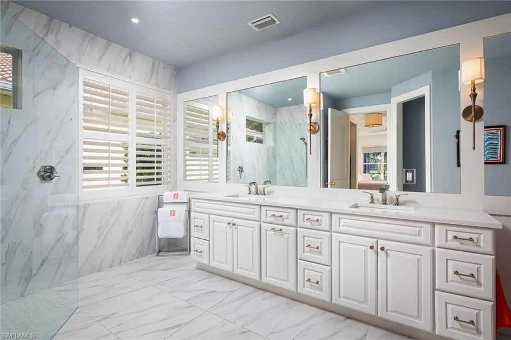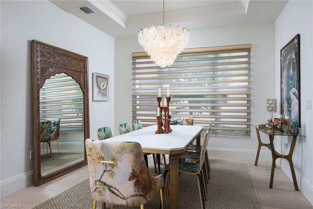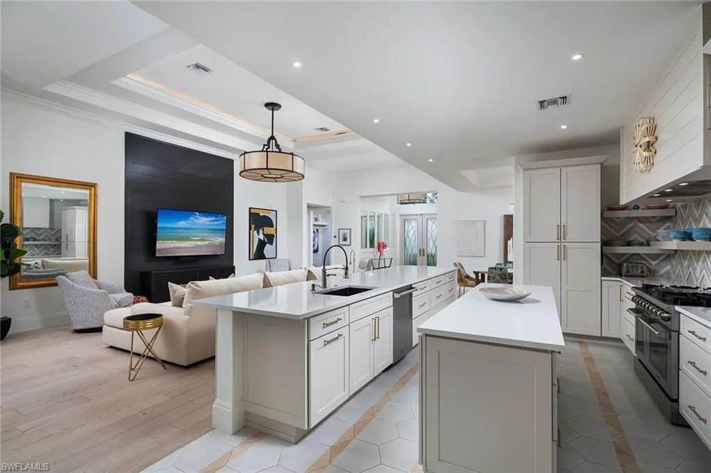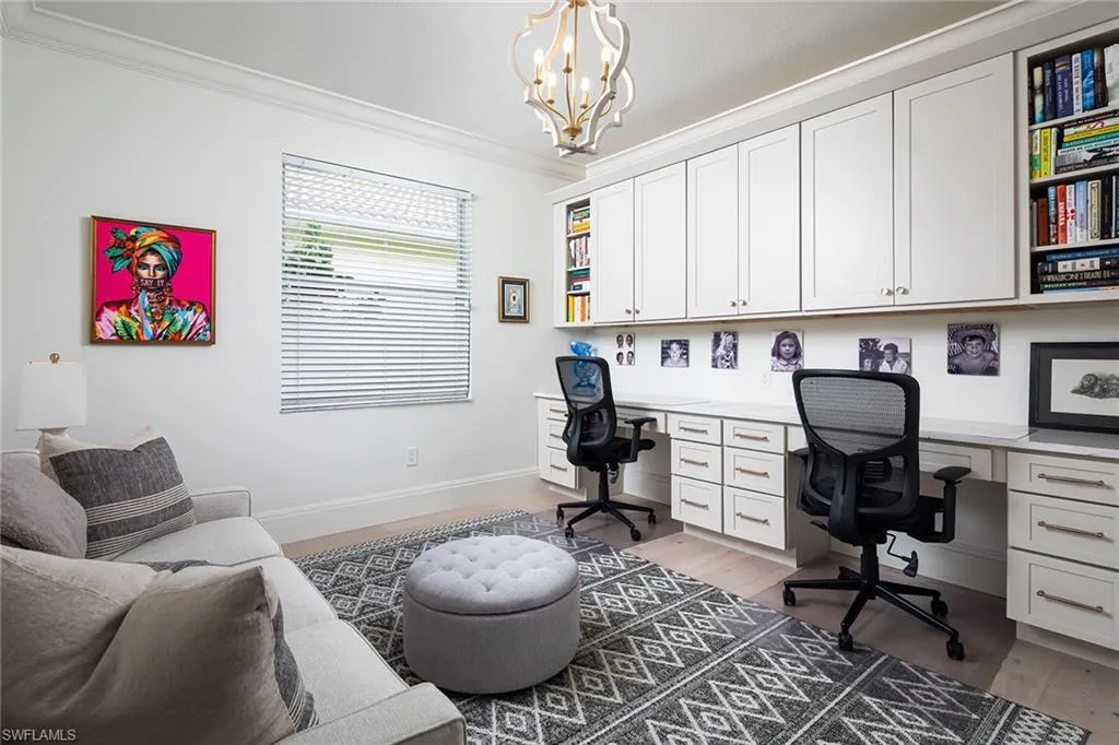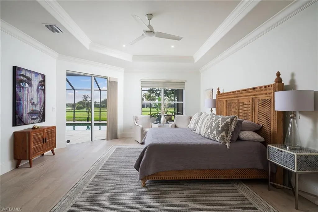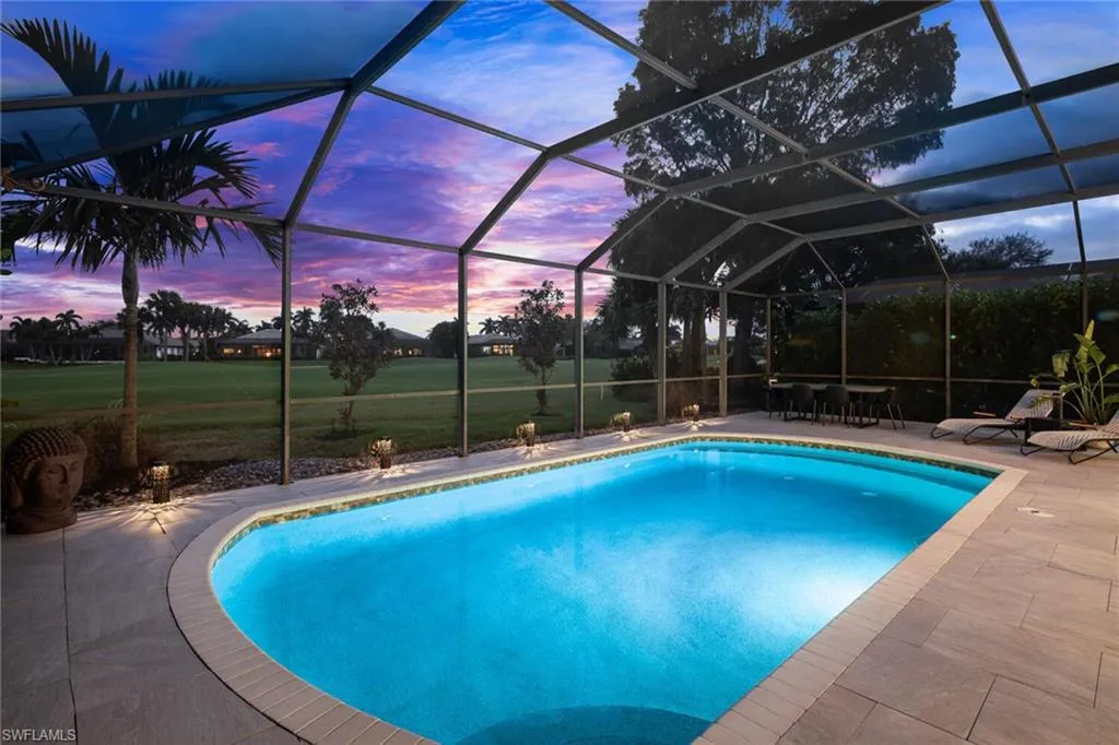 Sophisticated total renovation and redesigned home offered turnkey with fabulous designer furnishings package, all on a prime southern exposure lot with broad golf course and lake views. Immediate full golf membership included. Fabulous cook’s kitchen with huge island with shiplap siding, Thor six-burner gas stove with double oven, Viking refrigerator, full-size wine cooler and icemaker, custom oven hood with shiplap siding, fabulous bar area, ample high-end cabinets with pullout drawers and more. Redesigned primary bath with oversized walk-in shower, large vanity and beautiful wood-framed mirrors. Other improvements include new roof in 2023, new paver driveway in 2023, white oak flooring, stylish chandeliers and lighting package, custom built-in desk and cabinets in the large study easily converted to a third bedroom, plantation shutters, beautiful custom-framed mirrors in the foyer and stylish glass-inlaid double front doors. Wonderful entertaining home with seamless flow to lanai with new stone pool deck and large covered gathering area combined with ample sunning area on pool deck. Naples Lakes Country Club is a sought-after bundled golf community that includes immediate full golf privileges, and active social and sports lifestyle.