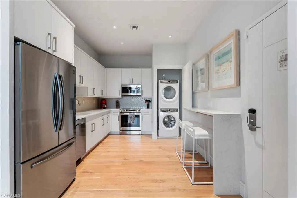 Fabulous, turnkey, and rarely available, this 2-bedroom, 2-bath residence at SoCe Flats offers a unique opportunity in the heart of Olde Naples. One of only two units in the building featuring a second full bathroom, this condo is fully furnished and accessorized by Clive Daniel Home, including linens, housewares, and décor — making it truly move-in ready. The open-concept layout includes a full kitchen, in-unit washer and dryer, and a private balcony off the living room, ideal for enjoying the Naples lifestyle. Zoned for short-term, daily rentals, this condo is wonderful for investors or seasonal owners, with flexible usage allowing up to 150 owner-occupied days per calendar year. Rent it through the on-site management company, manage it independently, or keep it for personal use — the choice is yours. Located just steps from 5th Avenue South, the Naples Design District, and the Gulf beaches, SoCe Flats blends boutique hotel-style amenities with the comfort of condominium living. Additional features include pet-friendly policies, an assigned covered parking space, Tesla charging station, air-conditioned storage lockers, and a rooftop amenity lounge with an outdoor kitchen. This is a rare opportunity to own a stylish, income-producing property in one of Naples’ most desirable locations. Property eligible for bonus tax depreciation as daily rentals are allowed – check with your CPA/Accountant for further details and eligibility.