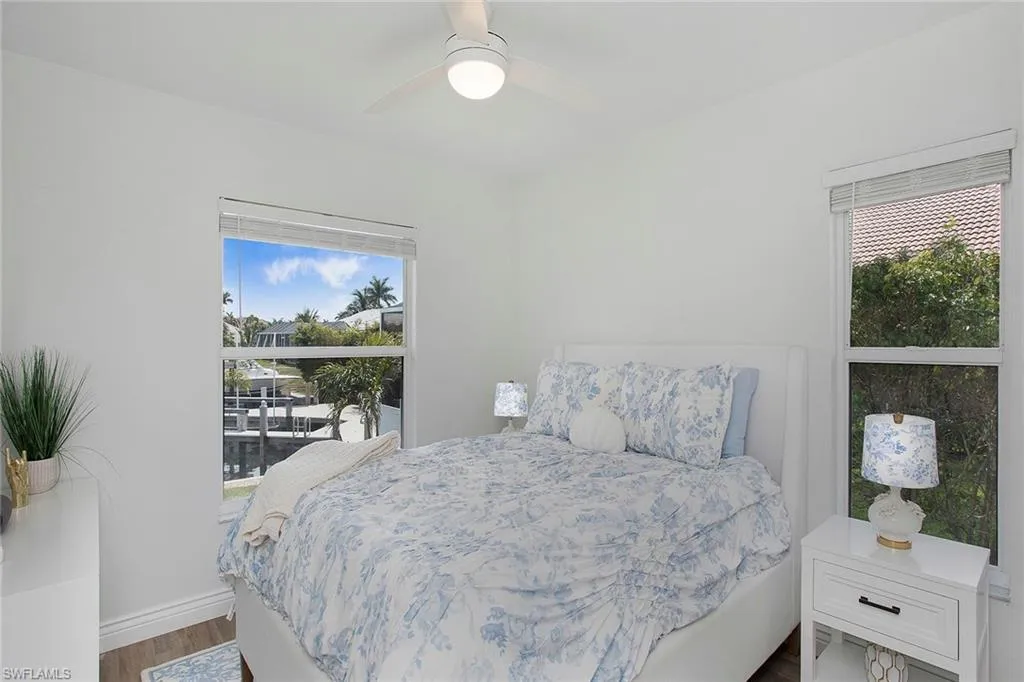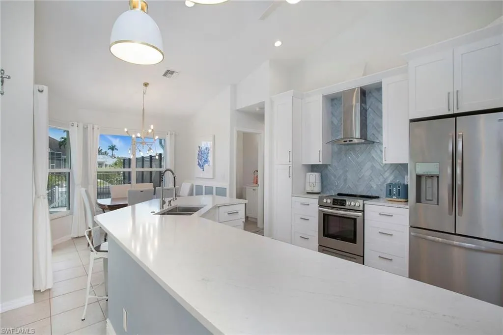 Discover your ultimate winter retreat at this exquisite waterfront residence on Marco Island, designed for those seeking a serene escape in sunny Florida. This luxurious home boasts three spacious bedrooms and two full baths, featuring an open, split floor plan that maximizes space and privacy. The heart of the home is the stunning remodeled kitchen, adorned with elegant white shaker cabinets, gleaming quartz countertops, and top-of-the-line stainless steel appliances. The wrap-around island with seating is perfect for casual dining and entertaining.