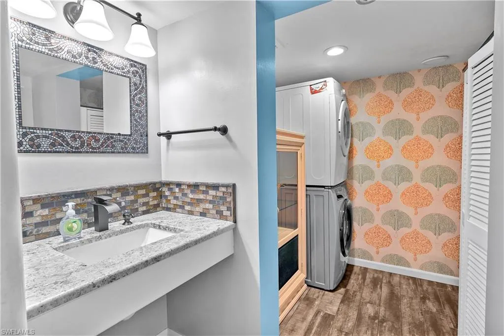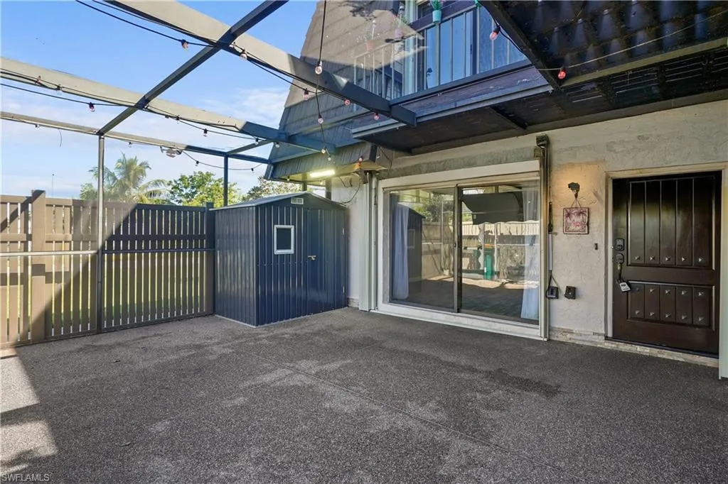 Super clean & updated 1393 sf 2 story townhouse. 2 huge bedrooms. 2.5 baths (1/2 bath main level). Porcelain plank tile throughout. 1st floor laundry. Massive, 20 x 17 screen lanai with shed for extra storage. Newer kitchen cabinets (soft close) granite, tile backsplash & stainless appliances. Each bedroom has its own updated bath as well as balcony with composite decking. Brand new hurricane shutters. This is a must see. Close to shopping, restaurants, beaches and I-75. Short walk to community pool. Hvac new 2024. Roof new 2024. Carport new 2025. Lanai screens new 2024.