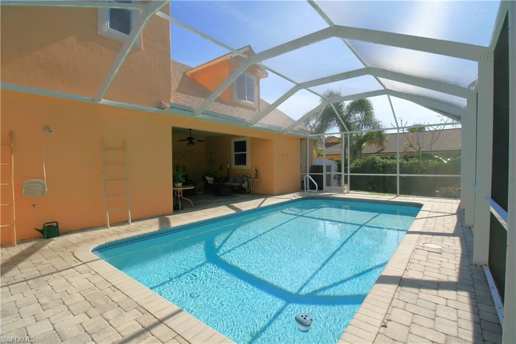 SE CAPE POOL HOME. I’m BEAUTIFUL inside. If you need space, this home is the LOWEST PRICE per square foot within miles! Remodeled Kitchen with creamy/white cabinets, level 4 granite and stainless appliances. Home boasts 3274 sq ft of living area and has a 4-CAR garage/workshop area. The downstairs is all tiled and has a family room/big kitchen area witha walk in pantry, breakfast nook, stools at the island, formal dining room/flex space, separate office, and a remodeled laundry room. Upstairs has four bedrooms and one is HUGE (27 x 18). The current owner uses it as a great room/tv, game room, and an additional guest bedroom. Home sits on a corner lot, is LUSHLY landscaped, and the back yard is FENCED. The LARGE pool and lanai have a pool cage. There is a front screened and covered front porch. Home has NEVER BEEN FLOODED. Roof was replaced in 2020, as well as the A/C. Most windows are impact. Brand new carpet on the stairs, hallway and primary bedroom. Home is in the heart of Cape Coral in the highly desirable Country Club area. House is across the street from what is to be our biggest city paark. Close to shopping, dining, and more. zIf you need space for vehicles, and family, this is it!
