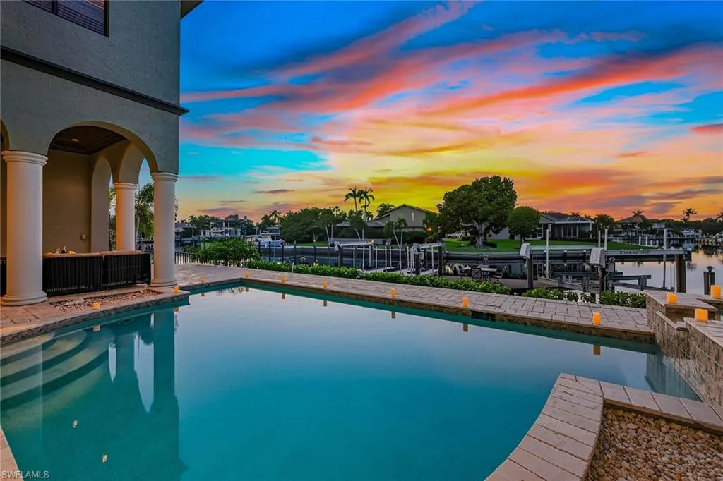 This stunning waterfront residence offers direct Gulf access, three private balconies, 80 feet of water frontage, and two spacious primary suites, creating an exceptional opportunity for luxurious coastal living. Designed with both comfort and style in mind, the two-story home features five bedrooms plus a den, five-and-a-half bathrooms, and two individual garages, each with one car parking, blending thoughtful design with modern finishes throughout. The exterior is highlighted by a 2022 roof, impact-resistant doors and windows, a grand mahogany double door entry, and a fenced backyard. Outdoor living is enhanced with a pool and spa, outdoor shower, rough-in for an outdoor kitchen, and wiring for outdoor speakers above the pool. A private dock provides quick Gulf access and comes equipped with a boat lift, a three-jet ski lift platform, and rip rap seawall reinforcement. Inside, the tray ceilings, recessed lighting, crown molding, modern ceiling fans, and white plantation shutters create a refined backdrop. The open floor plan includes tile flooring on the first level, wood flooring upstairs, and custom closets in all bedrooms. The chef’s kitchen showcases transom windows above a glass slider opening to the pool, a tile backsplash, a large five-seater island with glass pendant lighting, a walk-in pantry, and stainless steel appliances, including a 5-burner gas cooktop. The great room impresses with a coffered ceiling, a floor-to-ceiling arched window, a built-in entertainment center, a gas fireplace, and transom windows above a double glass door opening to the pool. A second floor loft with a nearby wet bar featuring a built-in wine cooler and two built-in beverage refrigerators offers additional entertaining space. The first-floor primary suite features two sliders to the pool area, dual walk-in closets, and a spa-inspired bath with dual vanities, a walk-in shower with a frameless glass enclosure, and a jetted tub. Upstairs, a second primary suite enjoys water views, a private balcony, and a luxurious ensuite bath. Three additional guest bedrooms are generously appointed, two with private balconies and ensuite baths, while the third has a nearby bath. A laundry room with a full-size washer and dryer and a utility sink adds convenience. Just minutes from Marco Island’s pristine beaches, upscale shopping, fine dining, golf courses, and attractions, this residence offers the ideal blend of coastal luxury and an active waterfront lifestyle. Whether boating, kayaking, paddleboarding, or simply relaxing poolside, this property embodies the best of island living with effortless gulf access. This residence conveys with a transferable flood policy, providing seamless protection and convenience for the new owner.