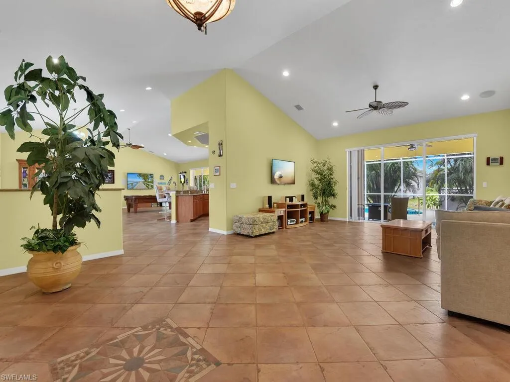 At the heart of the home, the kitchen features an expansive breakfast bar, cherry wood cabinets with custom pull-out shelving, granite countertops and a center island. Ideal for entertaining, the open great room with formal dining and soaring vaulted ceilings (9’4” to 12’), flows seamlessly through 8’ pocketing sliders to an expansive (1,327-square-foot) screened lanai and pool deck, perfect for hosting or relaxing under the Florida sun.
