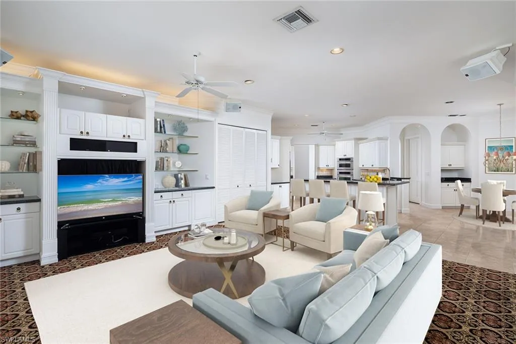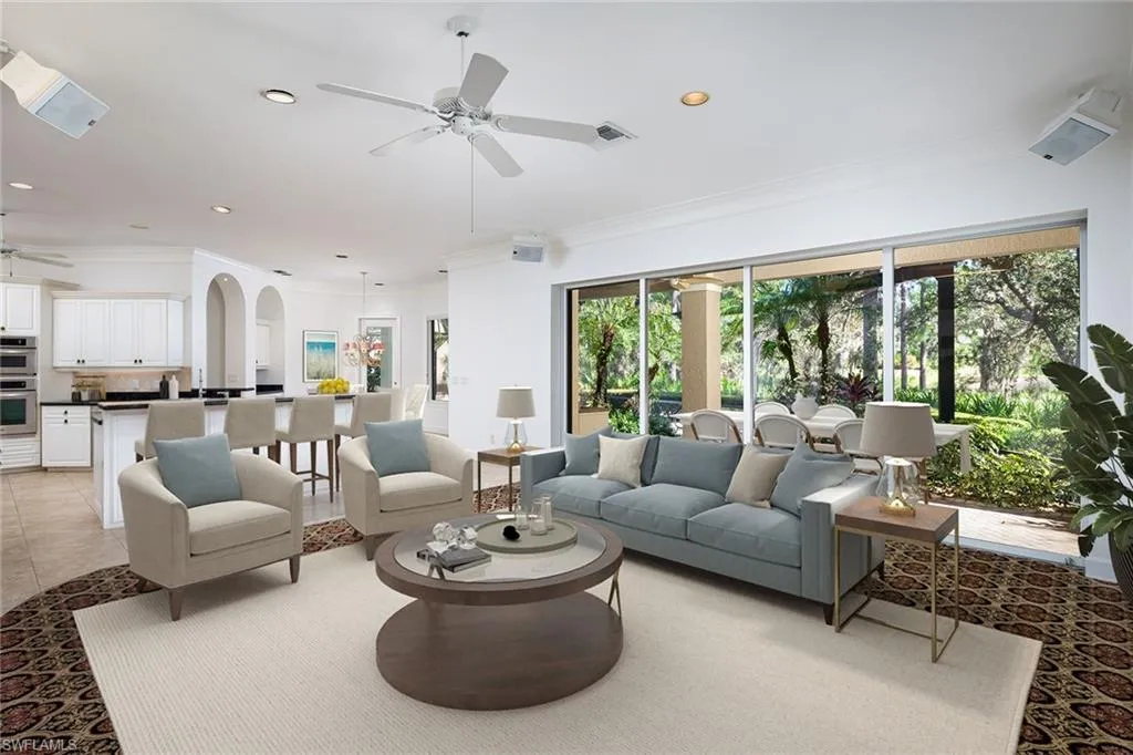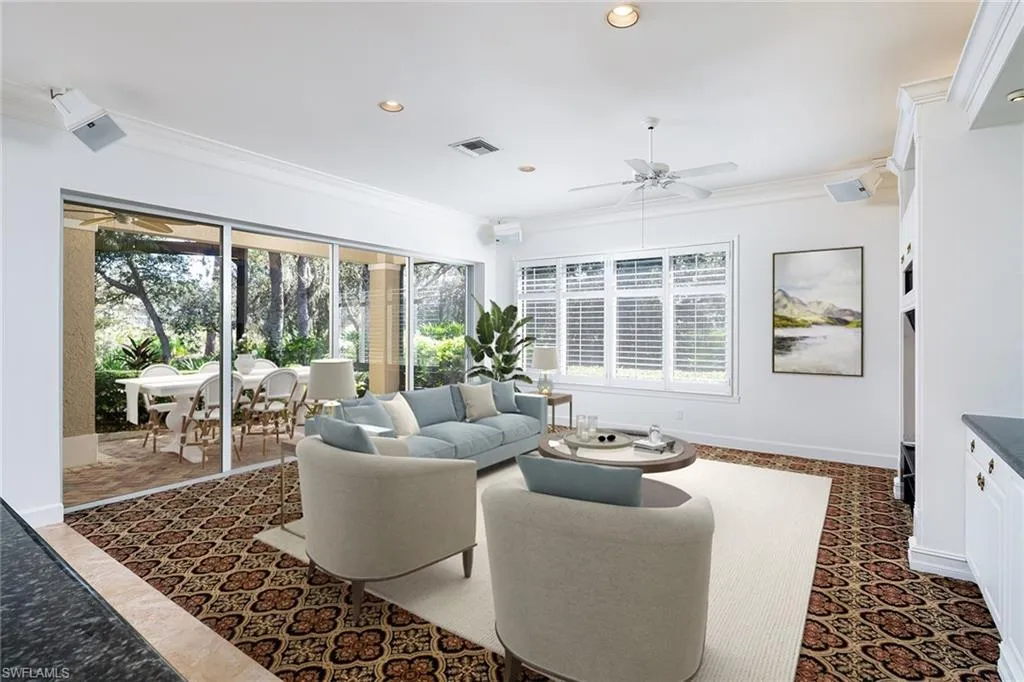 Stately front elevation is the signature of this beautiful home on oversize lot on the eighth hole of Collier’s Reserve. With 12- 14-foot ceilings, 8-foot solid-core doors, rich wood floors in bedrooms, sprawling floor plan and loads of architectural detail make this a timeless beauty. Well-manicured and meticulously maintained, this home offers newer roof in 2018, new picture frame pool cage, recently refurbished pool and spa, and newer stainless appliances. Terrific floor plan offers versatility with a fitness studio off the massive owner’s suite which could also be art studio, or den which could also be used as a bedroom with its walk-in closet. A three-car garage completes the package! Collier’s Reserve is an intimate community with only 224 homes less than two miles from Vanderbilt Beach. Collier’s Reserve natural beauty on 450 acres was recognized as the world’s first-ever Audubon Signature Sanctuary. As of Oct. 1, 2025, there is no wait list for full golf membership for residents.