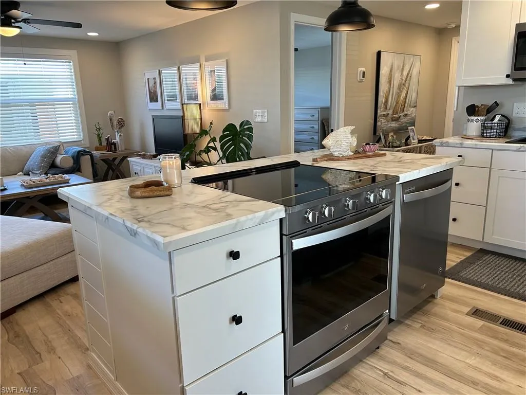 This property offers the perfect blend of modern comfort and convenience. Boasting 2 bedrooms and 2 bathrooms, this cozy abode features a thoughtful layout designed for easy living. Step inside to discover a bright and airy interior, complete with stylish finishes and ample natural light throughout. The updated kitchen engulfs sleek countertops, stainless steel appliances, and plenty of cabinet space for storage. Both bathrooms have been beautifully remodeled and include an electric water heater. Enjoy the convenience of laundry at residence and exterior storage right outside your front door. Amenities include a clubhouse, community pool, and shuffle board. Just 10 minutes from Fort Myers beach, this prime location and completely modern renovation presents an incredible opportunity for both investors and homeowners alike. Notable Upgrades – New sewer lines, complete electrical rewire, new meter socket heads, all new plumbing, new 2025 HVAC, new duct work, complete interior upgrade. This property had no hurricane damage after being remediated from Ian.