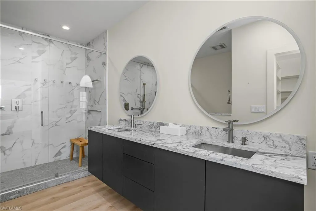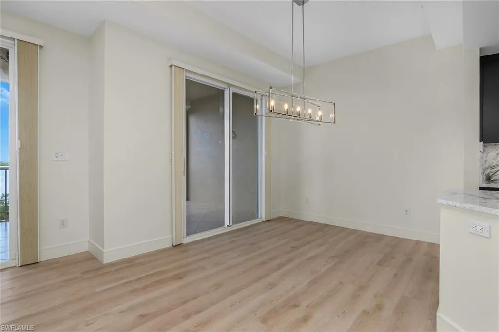 The true essence of Vintage Bay – 6th floor of a 7-story building equals million-dollar views! Totally remodeled with lots of unique upgrades. Gorgeous black & white Quartz Island kitchen with matching counters & backsplash and designer lighting. Two amazing new walk-in (glassed-in) baths with a master that must be seen to appreciate. This master ensuite includes a walk in California Closet system with built-ins to satisfy office living if desired. Vinyl plank flooring throughout, electric Storm Smart hurricane lanai shutters (with manual backup). Both bedrooms have custom plantation shutters, and the interior of the great room also has additional sunshades. Guest BR has Murphy bed and custom cabinetry for a perfect office/den option. Laundry room in unit. Enjoy sunsets, nature & wildlife from huge screened in lanai. Newer A/C (2023), and recent hot water heater. Community pool, clubhouse, nature boardwalk thru mangroves to a delightful, covered gazebo resting on scenic Barfield Bay. Sunsets galore, or for the early riser enjoy sunrises over Goodland & Naples. Vintage Bay is a gated community and one of the best kept secrets on Marco Island. Don’t miss this.