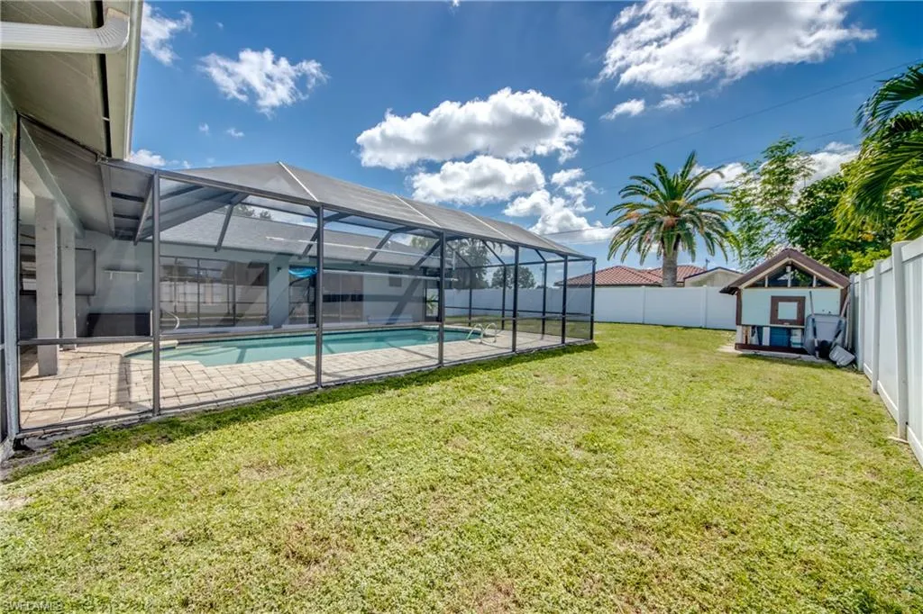 Discover the perfect blend of comfort, convenience and style in this beautifully maintained corner-lot single-family pool home in this desirable SE Cape Coral neighborhood. Featuring 3 bedrooms, 2 bathrooms, and 1551 square feet of living space, this residence is designed for both relaxation and entertaining. Step inside to an inviting open floor plan with abundant natural light, a spacious living area, and a well-appointed kitchen with plenty of cabinet space. The master suite provides a private retreat with a walk-in closet and en-suite bath, while two additional bedrooms offer flexibility for family, guests, or a home office. The outdoor living space is a true highlight. The large screened lanai with sparkling pool is ideal for year-round enjoyment, whether lounging in the sun, hosting barbecues, or enjoying evening swims. Includes an inside laundry room for convenience. A two-car garage provides plenty of storage, while the spacious backyard and tropical landscaping complete the setting. Conveniently located near shopping, dining, schools, banks, churches, and parks, with easy access to Fort Myers and Southwest Florida’s beautiful beaches, this home is move-in ready and waiting for its new owner. Don’t miss your chance to own this Cape Coral pool home!