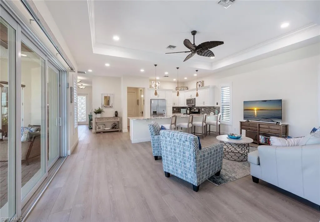 Unique courtyard home offering 3 bedrooms, 2 and a half baths, 2 car garage, pool & fully fenced yard. The open-concept layout features wood look flooring that flows effortlessly throughout with style and functionality. A gourmet kitchen takes center stage featuring an island with generous seating, stainless steel appliances, white shaker cabinets complimented by granite counters, is the perfect place to cook and entertain. Two spacious guest bedrooms adjoined by a jack and jill bath. The primary suite overlooks the pool, creating a tranquil retreat, featuring a large glass shower, dual sinks, his and hers closets. Features throughout the home include 10ft ceilings, crown molding, wood-look floors, plantation shutters, designer lighting & fans, impact doors & windows throughout. Back yard features a 36′ X 28′ deck perfect for entertaining. Located less than 1 mile to Vanderbilt Beach and Wiggins Pass State Park as well as upscale shopping and dining at Mercato. This property is offered turnkey furnished & is move-in ready. Whether you’re looking for your dream home or a high yield vacation rental, this Naples Park retreat offers unmatched quality and appeal. High and dry NO storm damage.