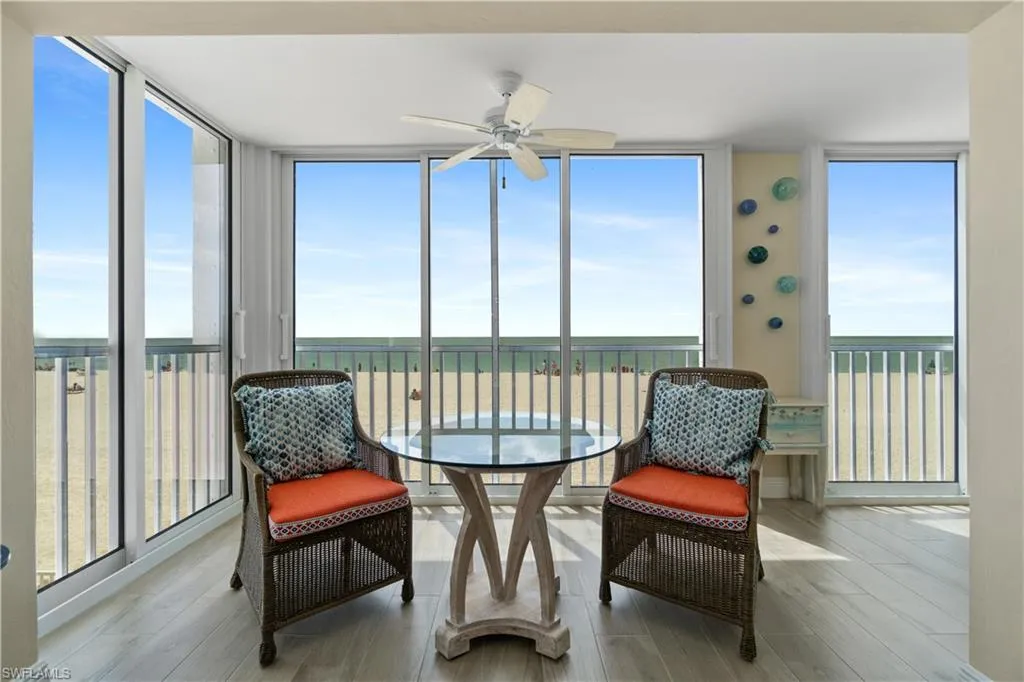 Beautifully renovated, coastal contemporary beachfront condo in Casa Bonita Grande on the peaceful north end of Bonita Beach. With breathtaking views of the turquoise waters and pristine white sands, this 2 bedroom, 2 bathroom condo is the perfect coastal retreat. This unit features a coveted second floor location with an exceptional view of the surf and the pool. Completely updated, the unit boasts beautiful marble countertops, wood-look tile flooring, new hurricane-impact sliders, a new HVAC system (2021) and a new water heater (2023). The enclosed air-conditioned lanai is an entertainer’s dream, offering the option to open the glass sliders and enjoy the sound of the surf. The beautifully remodeled chef’s kitchen is complete with crisp white cabinetry and new GE stainless steel appliances (2021). Additional features include a designated covered parking space, ample guest parking, and convenient access to the second floor sundeck with a gas grill and spacious seating areas – perfect for relaxation or entertaining. Casa Bonita Grande is financially solid with fully funded capital reserves and offers resort-style amenities, including a beachside pool, community room, a fitness center and more.