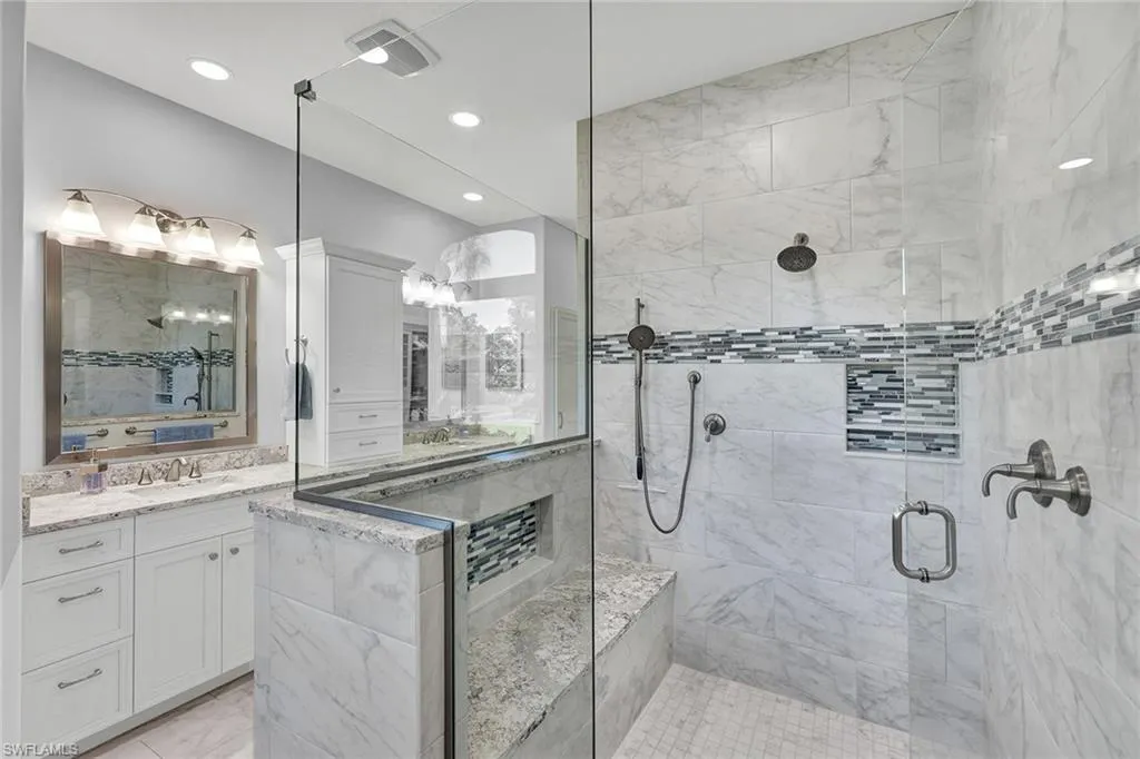 The home features a three-car garage, impact-resistant windows and a dedicated EV charging circuit. Its flexible layout includes four bedrooms, a den and five baths—three full and two half. Interior upgrades include a redesigned kitchen and guest baths, wood-look tile throughout the main level, and oak flooring upstairs. The primary bath was remodeled in 2020, followed by a full interior transformation from 2021 to 2025. Additional enhancements include a resurfaced pool with leathered marble pavers and updated driveway and walkway pavers.