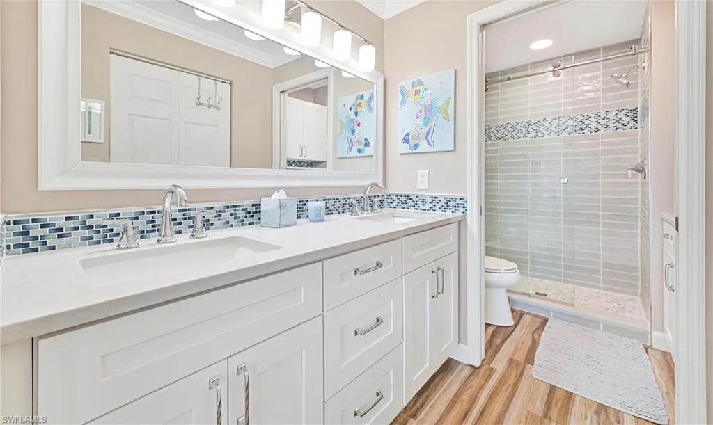 The primary suite is a private retreat featuring a walk-in closet and a spa-like en suite bathroom with dual vanities and a walk-in shower. A generously sized guest bedroom and updated guest bath provide comfort and privacy for family or visitors. Additional upgrades include new flooring, fresh paint, updated lighting, and in-unit laundry for ultimate convenience.