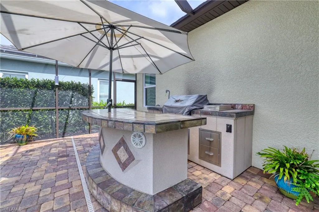 Inside, timeless travertine floors, raised-panel cabinetry, and granite countertops set the stage for elegant living and effortless entertaining. Step outside to your private retreat with a sparkling pool and spa, complete with a tiki hut—the perfect spot to unwind with a beverage while soaking in breathtaking sunsets over the water.
