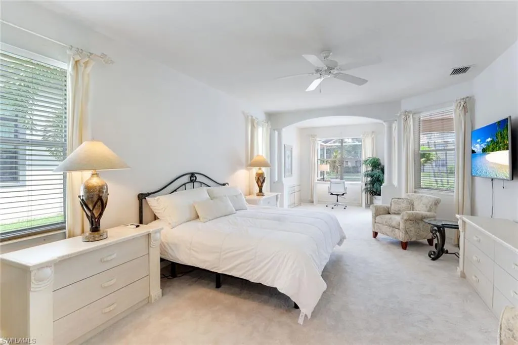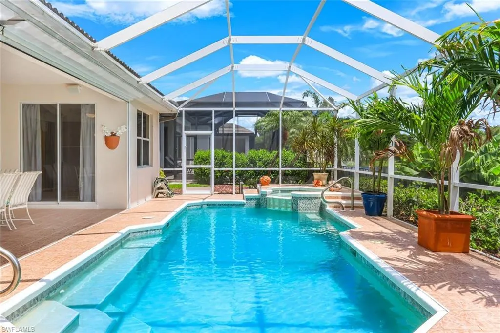 Ready for Immediate Occupancy! Turnkey Furnished with $10,000 New Appliance Allowance! Welcome to Cape Harbour, Southwest Florida’s premier gated yachting community, where luxury waterfront living blends seamlessly with resort-style amenities. Nestled in Gate 1, this stunning lakefront residence is designed to make every dream a reality. Step into an expansive open-concept layout bathed in natural light from water-view bay windows. A flexible dining/sitting area flows effortlessly into a split floor plan, with a pocket-door ensuring guest rooms privacy. The oversized master suite is a true retreat, featuring a cozy sitting area or office, lanai access, dual walk-in closets, and a luxurious spa-like bathroom with dual vanities, a walk-through shower, and deep soaking tub. Unwind to serene lake views framed by swaying palms, vibrant hibiscus, and lush banana and avocado trees—all from your private lanai with an electric-heated pool and spa. Grab your golf cart and zip to the community clubhouse for a workout, or dockside at the world-class marina for waterfront dining. Slip on your dancing shoes for year-round live entertainment that keeps the energy alive. Don’t miss this chance to celebrate the upcoming holidays in your new Southwest Florida paradise—schedule your private tour today!