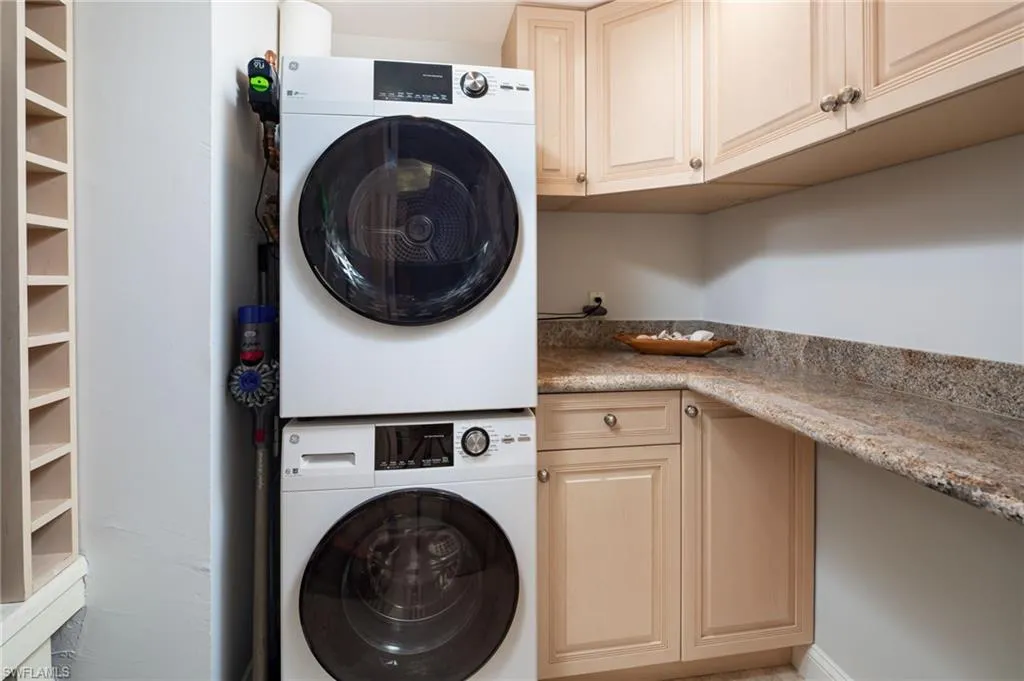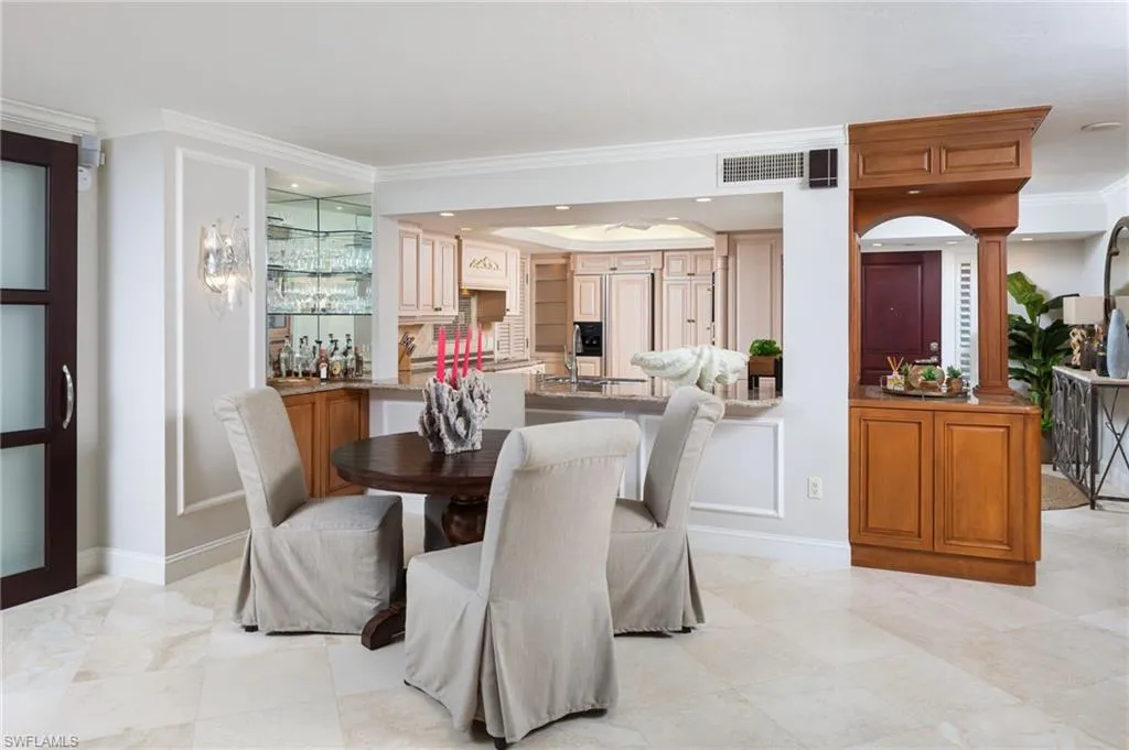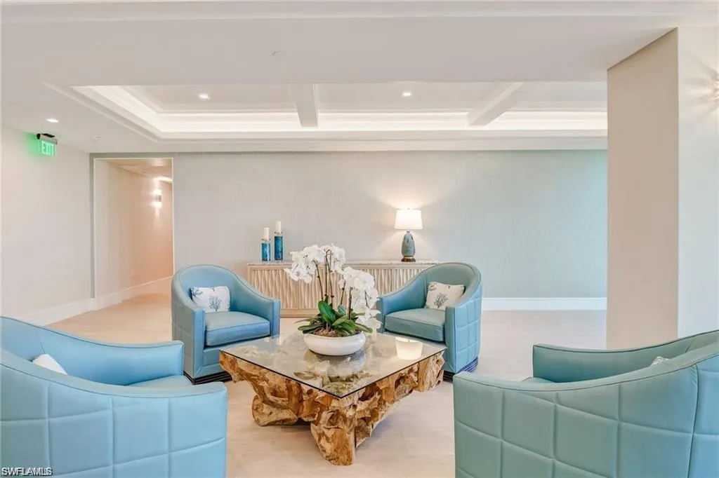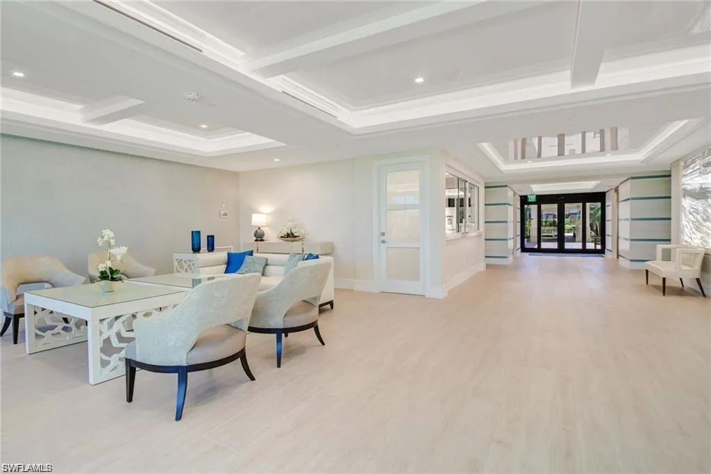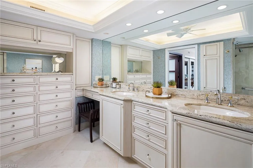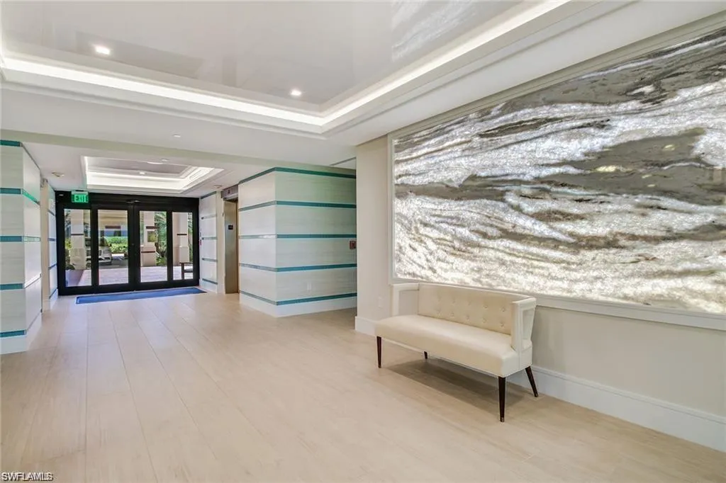 Capture mesmerizing Gulf and city views from this meticulously remodeled unit, featuring a redesigned floor plan and breathtaking ocean vistas from the front door and every room. Luxurious finishes include Saturnia marble along with richly appointed custom wood doors, built-ins, and solid wood cabinetry throughout. This rarely available layout boasts two Gulf-front master suites, separated by a central great room designed for both intimate gatherings and large-scale entertaining. The chef’s kitchen is elegantly appointed with newly sealed granite countertops, a cooktop, wall oven with convection microwave, warming drawers, refrigerator drawers, and paneled appliances for timeless appeal. The great room showcases a custom built-in with motorized TV lift, Italian glass sconce lighting, a dry bar, and a dramatic backdrop of pocketing curtain sliders that open to the oversized lanai—ideal for both dining and lounging. Enjoy unobstructed water views by day and cinematic cityscape lights along Gulf Shore Drive by night. Through double wood and glass panel doors lies the first master suite, featuring an expanded walk-in closet, an updated spa-like bath with extensive cabinetry and frameless glass shower, and a custom king bed with multi-layered wood entertainment center. The second suite is ideal for a working professional or entertainer, with a built-in office, bookcase doors, and a flexible entertainment space that converts into a bedroom with two twin Murphy beds. This condo’s thoughtful upgrades make beach living low-maintenance, with electric hurricane shutters, an on-demand water heater, fresh paint, and newly sealed stone floors and countertops. Vanderbilt Gulfside is one of Naples’ premier beachfront communities, offering a gated entrance, impressive attended lobbies with on-site management, and top-tier amenities. Residents enjoy 750 feet of pristine beach frontage, the largest heated saltwater pool on Vanderbilt Beach, two guest suites, two tennis courts, Tesla charging stations, barbecue grills, and an exercise facility—all overlooking more than 8 acres of professionally landscaped grounds. Each residence includes private storage and deeded covered parking. With ample reserves and strong insurance coverage, Vanderbilt Gulfside is an extremely secure and financially sound complex.