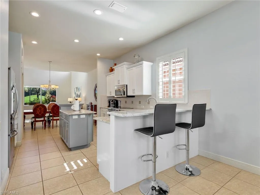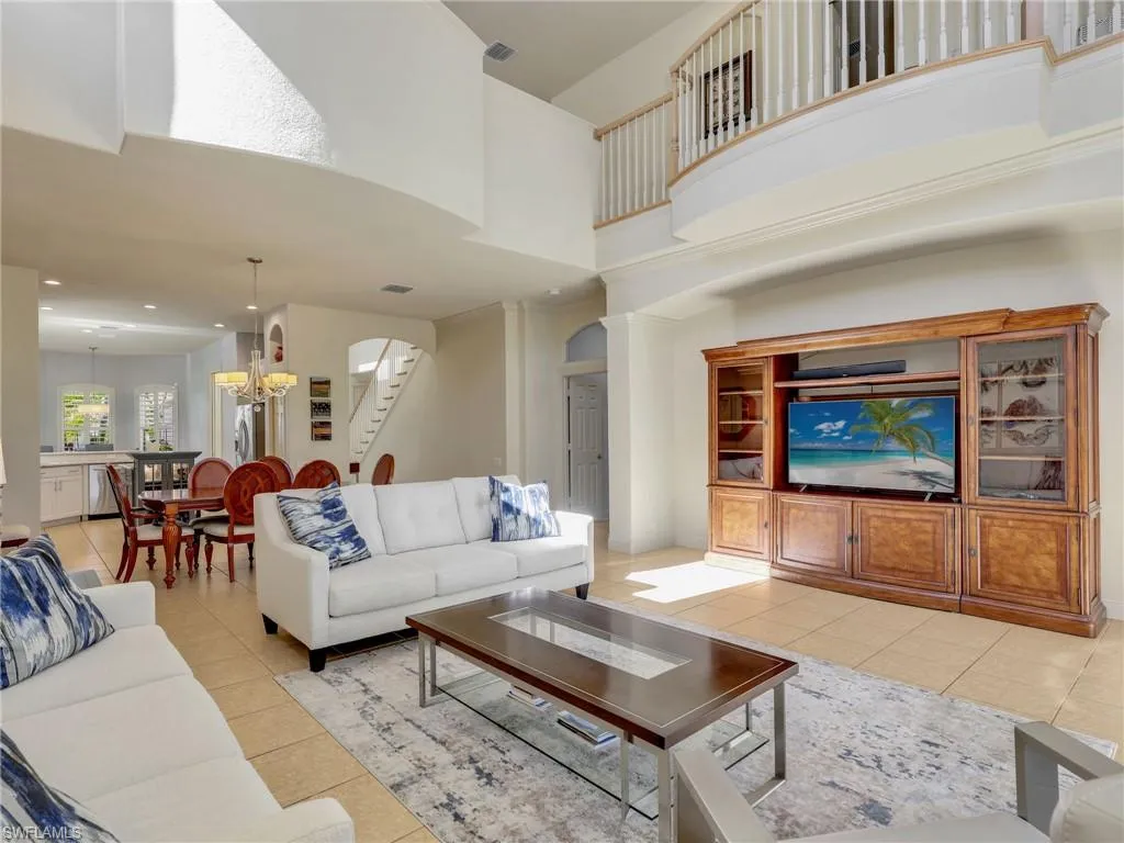 This stunning Pelican Marsh pool home is located in the sought after neighborhood of Ivy Pointe within the gates of prestigious Pelican Marsh. Located on the 9th hole and within walking distance to Pelican Marsh Country Club certainly makes this home a rare opportunity. Upon entering the 8ft doors, get swept away with the 14’ ceilings, the grand wood staircase and the open floor plan on the 1st floor. There is a lovely kitchen with tile on the diagonal and white cabinetry that overlooks the eat in kitchen & triple windows. The dining room is inviting and seats 8 comfortably. Entering the primary living space, you experience the soaring ceilings and can enjoy overlooking the 9th hole and oversized salt water pool / spa. The patio area allows for expanded seating and accommodates outdoor dining for family & friends. The primary bedroom is well positioned on the first floor and offers extended living overlooking the pool and golf course. The primary bathroom is spacious with both a walk in shower and tub. The den, located off the kitchen is light and bright and is perfect for work from home families.
