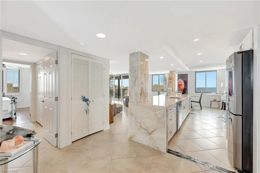RARELY AVAILABLE PENTHOUSE, 11th floor condo with panoramic gulf and bay views from EVERY window of this STUNNING CORNER condo with expansive wrap around lanai. Have the best of both worlds with breathtaking sunsets and light, warm southern exposure. Only a 5 minute stroll to Vanderbilt Beach and Wiggins Pass State Park while providing peace of mind with electric shutters and impact windows plus a coveted covered parking spot. Enjoy your open kitchen featuring gorgeous, “one of a kind”, marble waterfall kitchen countertops with high end appliances. Plenty of room for beach toys and bikes with 2 exterior storage units. FEES COVER EVERYTHING BUT ELECTRIC and 9, 30 day leases are permitted. Vanderbilt Surf Colony I has it all with a Private Lap Pool, Tennis, Pickleball, Bocce and Kayak lease spaces. Marina Boat Docks for lease pending availability. The Vanderbilt Surf Colony lobby has also been completely remodeled to include a fully equipped exercise and social room with kitchen and ping pong table and 11 Bluebill boasts a new roof, elevators, exterior paint and lanais. Nothing to do but sit back and relax and enjoy your condo located on Naples “best kept secret peninsula”, tucked away from the hubbub but minutes to Mercato fine dining, shops and entertainment. Paradise awaits!