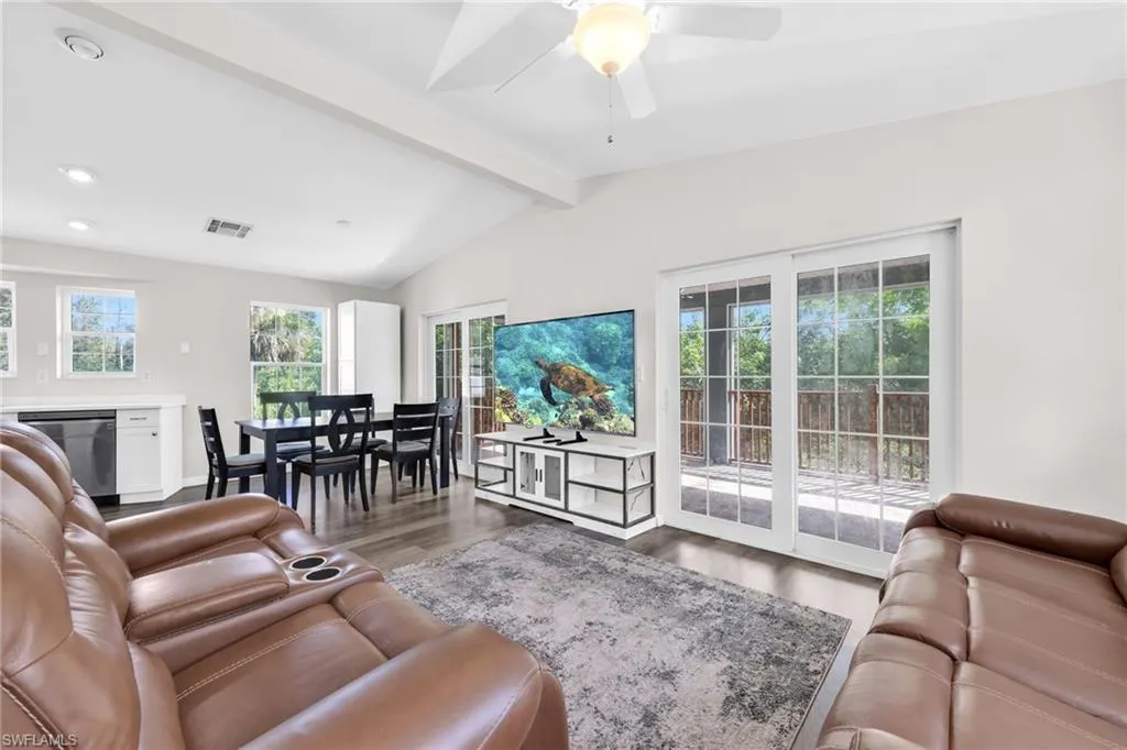From the living area, sliding doors lead to a screened, covered lanai balcony, the perfect spot to enjoy morning coffee or unwind in the evenings while taking in the peaceful surroundings. Beyond the lanai, the backyard stretches across 1.14 acres, blending landscaped areas with natural wooded spaces. There’s plenty of room to add a pool, fire pit, or create a custom outdoor retreat. Beneath the home, the elevated design provides generous storage, while privacy hedges along the front and east side enhance the secluded feel.