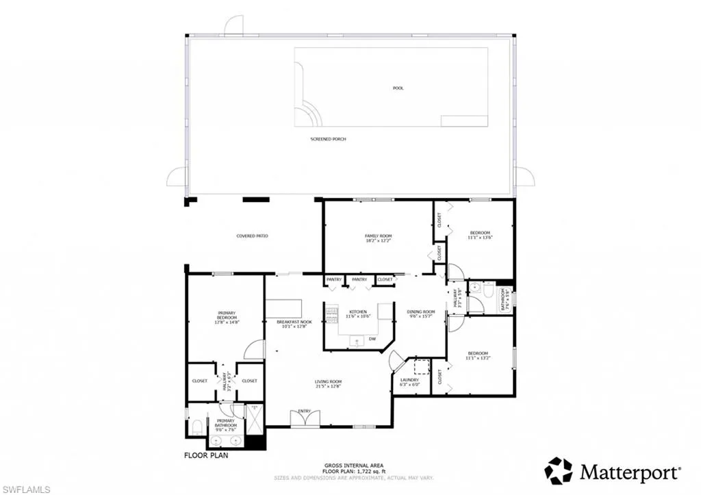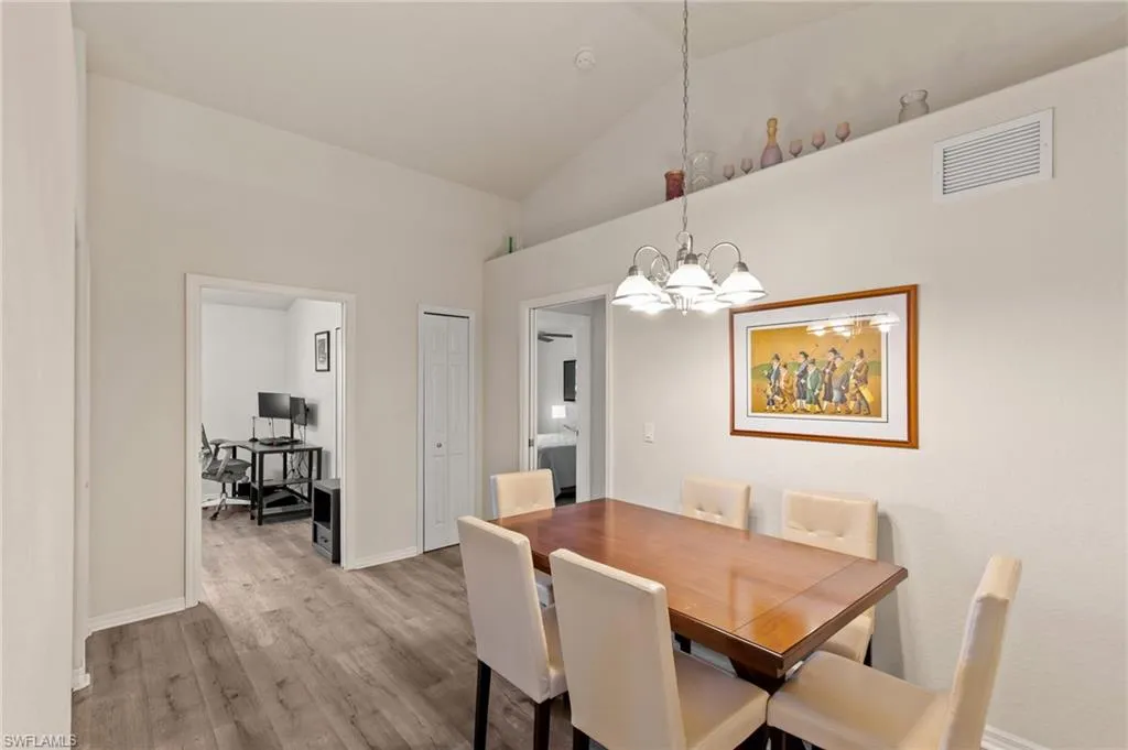 Discover Gulf-access canalfront living at its finest! This 4-bedroom, 2-bathroom home features a saltwater heated pool, screened lanai with a hot tub, and stunning southern exposure offering breathtaking sunrise and sunset views over the canal. Boating enthusiasts will appreciate the captain’s walk boat dock and 10,000 lb boat lift, complete with electricity and water at the dock. Inside, vaulted ceilings create a bright and spacious living area that flows into a breakfast nook with a breakfast bar. The kitchen offers updated stainless steel appliances and ample cabinet storage, adjacent to a formal dining area. The split bedroom layout provides privacy, with the primary suite featuring his-and-hers walk-in closets and an ensuite bathroom with dual vanity. On the opposite side, three additional bedrooms share a full bath, including one oversized room perfect as a den, office, or generous bedroom.