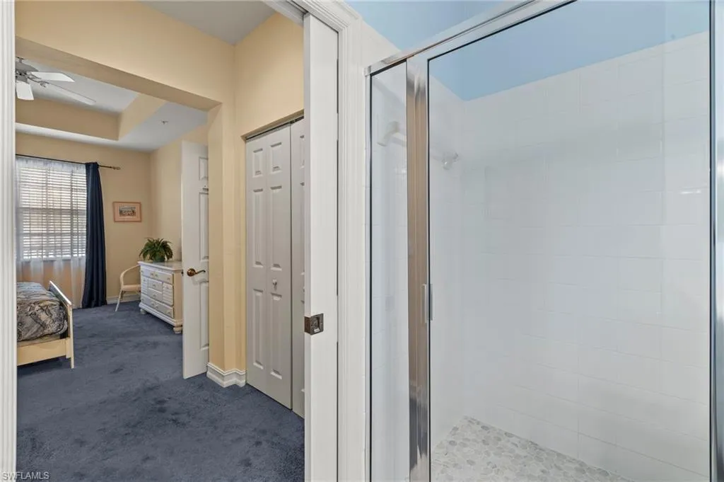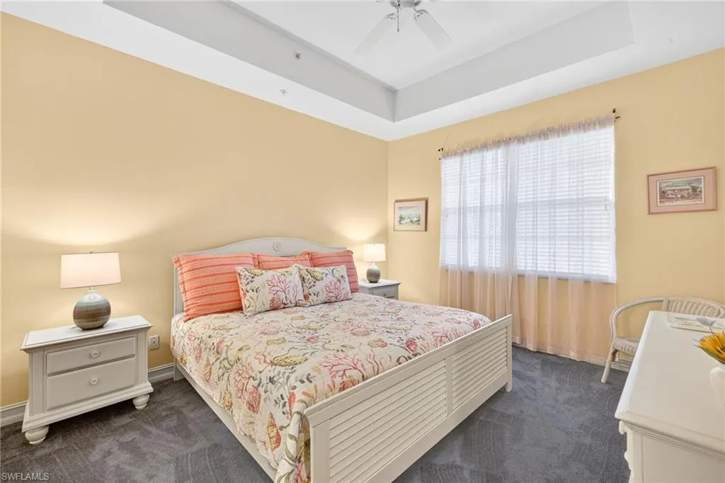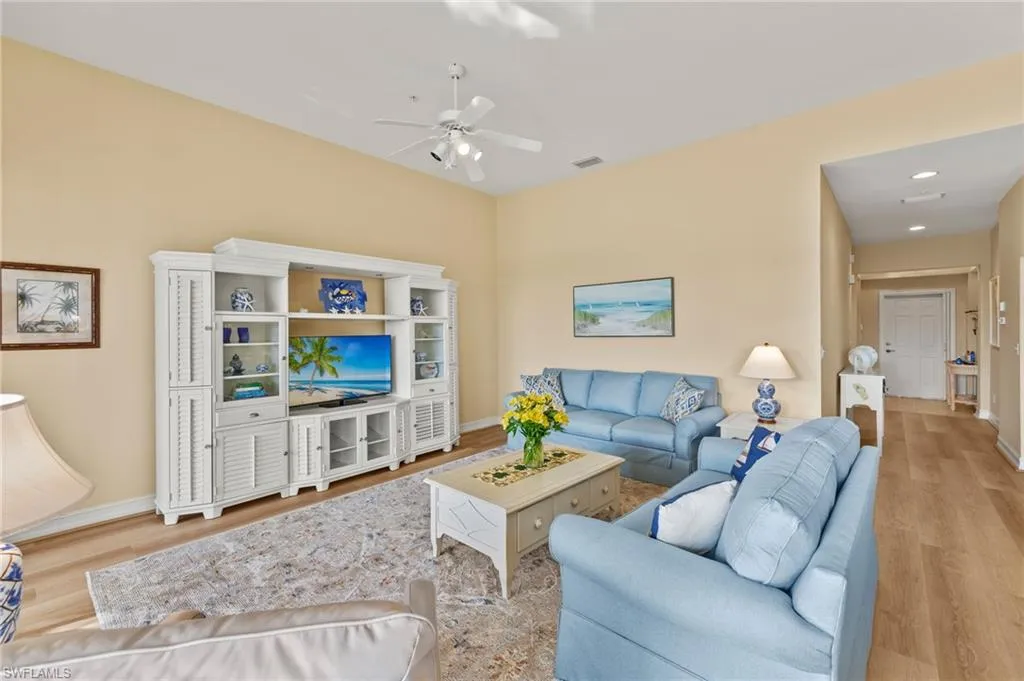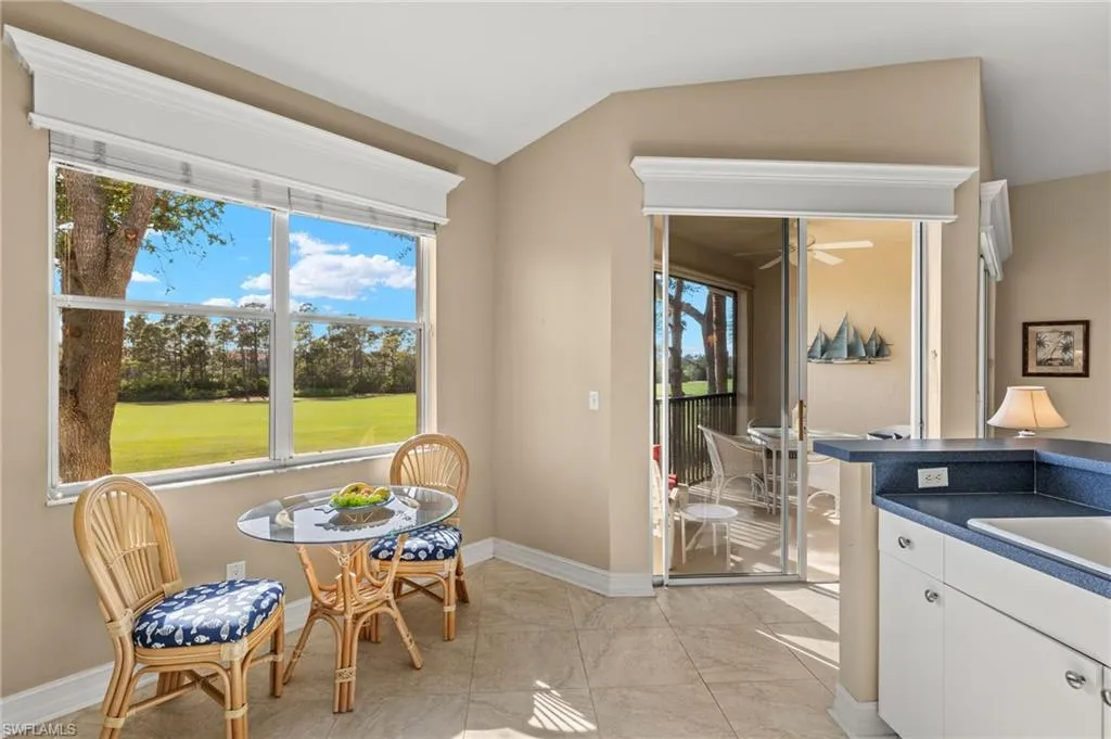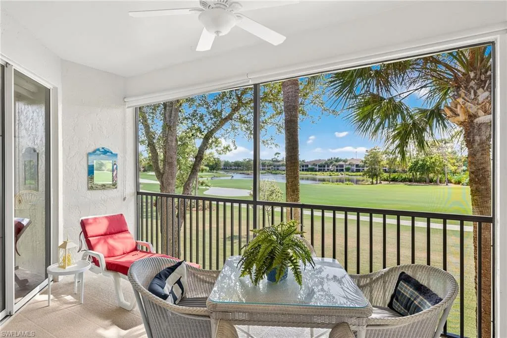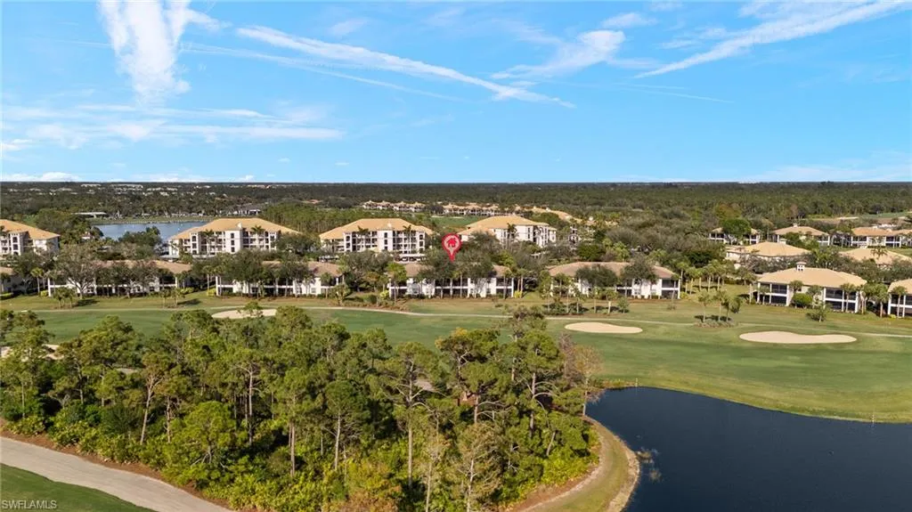 Welcome to your serene retreat in paradise! This beautifully maintained 2 bedroom, 2 bath top floor condo offers volume ceilings and bright southern exposure, perfectly positioned just off the second fairway for breathtaking golf course and lake views from the screened lanai. Step inside to find a stylish blend of comfort and and function, featuring luxury vinyl flooring in the living area and 20 inch tile in the kitchen and bathrooms. This home is being sold TURNKEY furnished, making it move in ready for seasonal or year round living. Golf and all amenities are included in the purchase of this home. Other upgrades include an LG refrigerator, oven and microwave 2024, A/C 2024, primary bath with granite countertop, and walk in shower with updated flooring. The roofs have been replaced and this section of the community has upgraded car ports. This home is located just steps from two community pool areas with grills, offering a lifestyle of luxury, comfort and convenience. If you are looking for an active lifestyle look no further: 27 holes of Championship golf, 14 pickleball, 8 tennis and 6 bocce courts. State of the art fitness center that is professionally staffed. Pelican Sound is nestled up to the Estero River with access to the Gulf. The community offers dry boat storage, kayaks, canoes and paddle boarding, along with a shuttle boat to Lovers Key State Beach Park. Minutes from RSW International airport and surrounded by fabulous shopping and restaurants. Start Living The Dream!