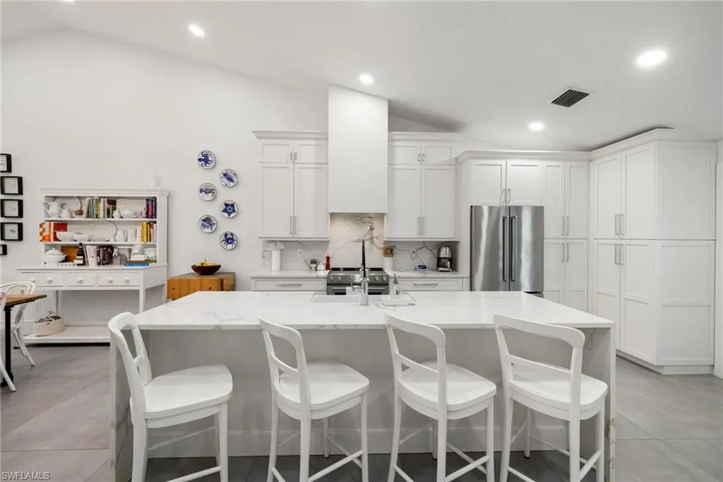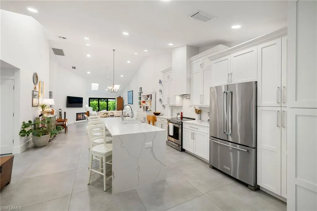 This elegantly remodeled villa is ideally located in the highly sought-after and rarely available Villas of Park Shore, a stone’s throw from the beach. Thoughtfully renovated from top to bottom, this residence offers modern luxury with every detail carefully curated. The eye-catching kitchen features custom cabinets, high-end stainless steel appliances, a seamless continuation of the countertop to the backsplash, a large island, chic hardware, and a convenient pot filler. The open-concept floor plan flows effortlessly into the bright, airy living area, where a cozy