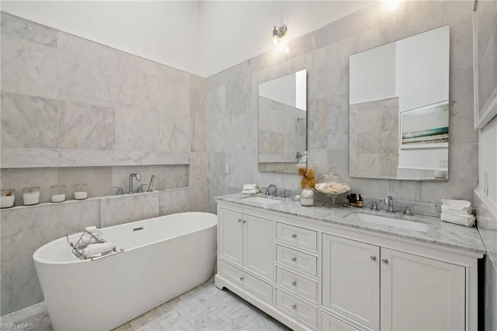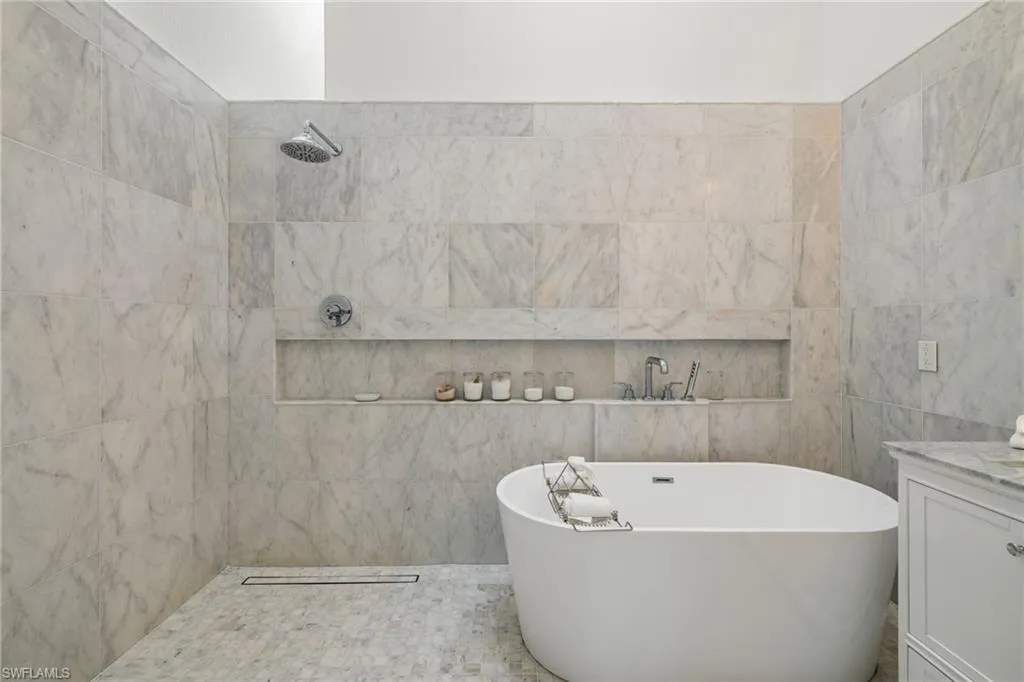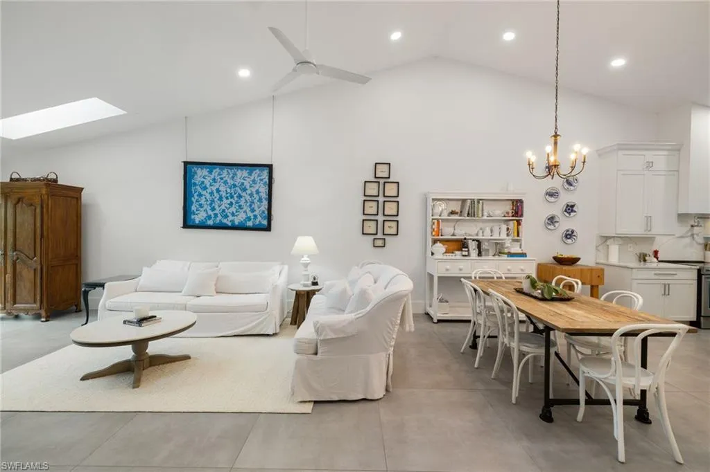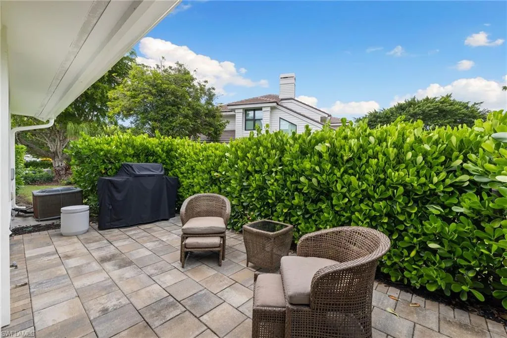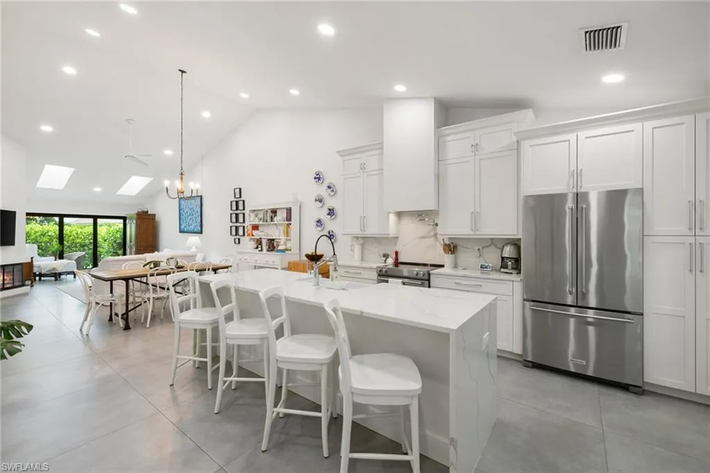 fireplace and abundant natural light from skylights and vaulted ceilings create a warm ambiance. The remodeled primary ensuite wet bath is a spa-inspired escape with a freestanding soaking tub, a separate shower, and premium finishes for ultimate relaxation. The beautifully remodeled laundry room adds both style and functionality. The gated custom courtyard and pavered lanai, surrounded by privacy hedges, offer serene retreats for outdoor living in both the front and back of the home. In addition to the stunning design, essential upgrades include hurricane impact windows, a tankless water heater, an A/C replacement (2019), and updated plumbing and electrical systems in 2019. The new flooring throughout, remodeled guest bath, and freshly painted exterior in 2024 complete this exceptional property. Enjoy community amenities, including a clubhouse, pool, and gym, and embrace the ideal Park Shore location, just minutes from sun-soaked Gulf beaches and the vibrant dining and entertainment options at Venetian Village. You can join the Park Shore Association for an additional fee, granting exclusive beach access, parking, a scenic walking trail, and a BBQ area. Don’t miss this rare opportunity to own a residence that combines