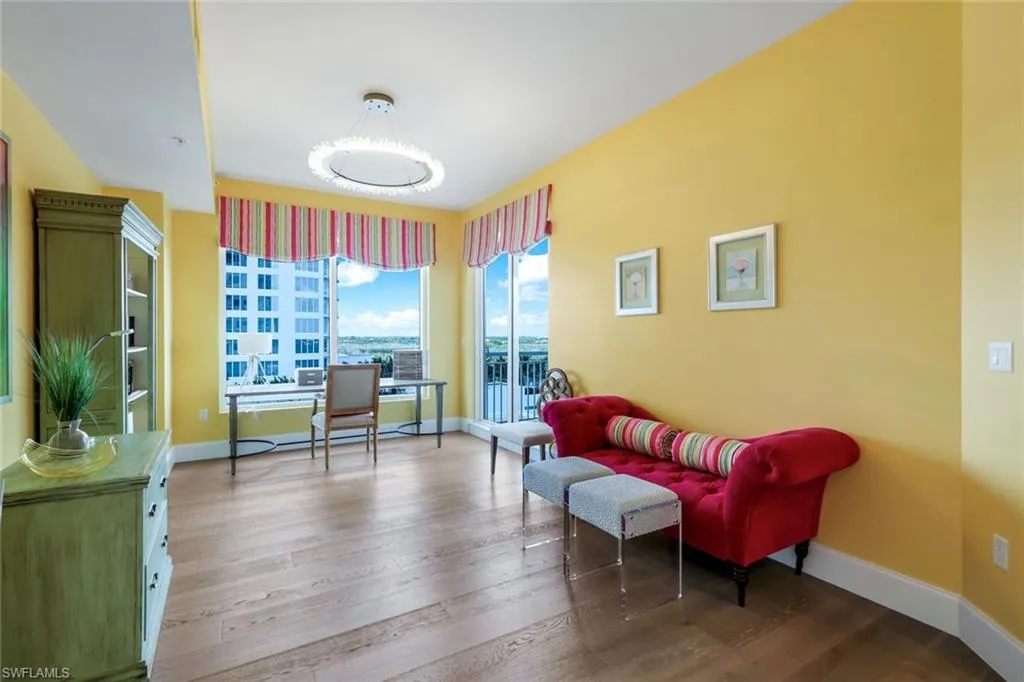 Indulge in the epitome of luxury living at SEAGLASS, in a prestigious corner residence that rarely becomes available. Upon entering through a private elevator foyer and double-door entry, you’re welcomed into an expansive 3-bedroom plus den/ office layout, featuring 3.5 elegant ensuite baths across 3,421 square feet of refined living space. Revel in breathtaking western views of Estero Bay, the golf course, and The Gulf of America. This residence boasts an array of high-end finishes, including exquisite tile flooring, a built-in flat- screen TV, and a linear fireplace. The chef’s kitchen is a culinary dream, equipped with a Thermador gas cooktop, custom European soft-close cabinetry, quartzite countertops, and a spacious island perfect for entertaining. Additional features include a pantry, a dry bar, intricate moldings, and 10ft ceilings, alongside, private storage and two coveted assigned parking spaces in the secure under-building garage. The luxurious owner’s suite offers two walk-in closets, custom finishes, and a breathtaking spa-like bath. The opposite wing hosts two generous guest suites, each with ensuite baths, walk-in closets, and private terraces. The screened lanai, complete with a built-in gas grill, invites you to dine al fresco while taking in the lush surroundings and stunning sunsets. SEAGLASS enhances your lifestyle with exceptional concierge services, a beautifully designed social club room, a theater, and a billiards and card room (currently being transformed by Clive Daniels). Enjoy access to private guest suites and a magnificent resort pool and spa. As a resident of Bonita Bay, you’ ll also benefit from a staff-attended private beach club on Bonita Beach, just a short 10-minute drive away, along with an on-site marina featuring a restaurant, boat storage, and ramp. Explore biking and hiking trails, kayak rentals, and three picturesque parks. By joining The Club at Bonita Bay, you’ll unlock access to five golf courses designed by Arthur Hill and Tom Fazio, 18 tennis courts, pickleball, a croquet lawn, and a zero-entry pool with poolside dining, along with five restaurants and a state-of-the-art Lifestyle Center fitness facility. Embrace the perfect balance – Live, Work and Play in Bonita Bay!