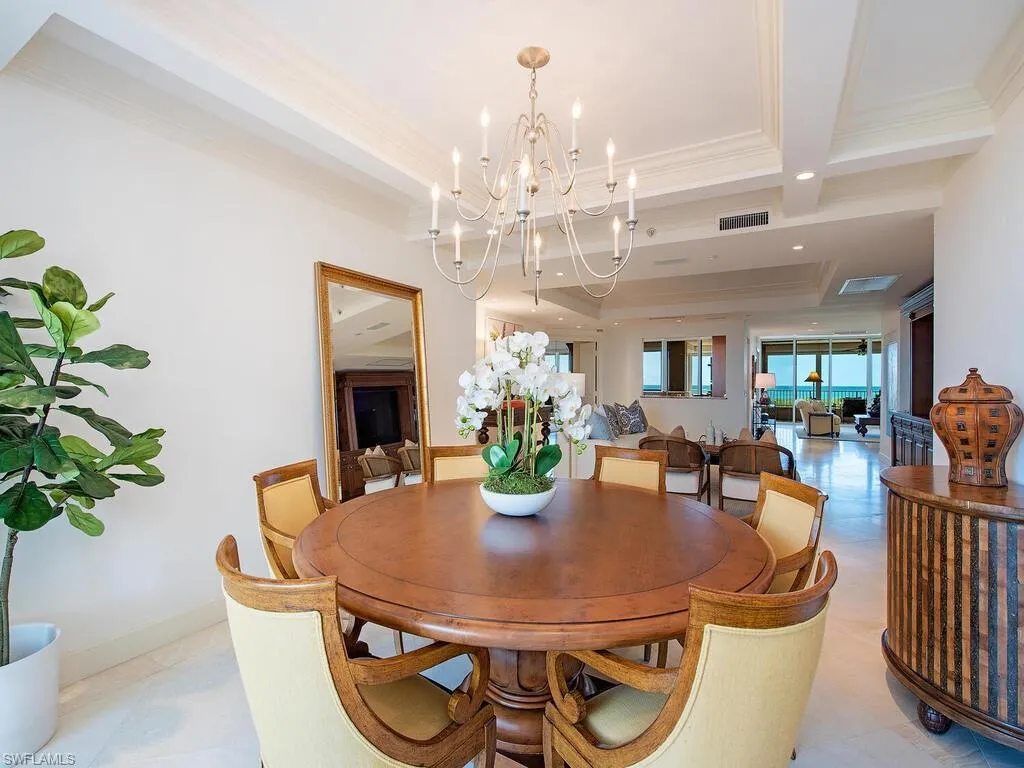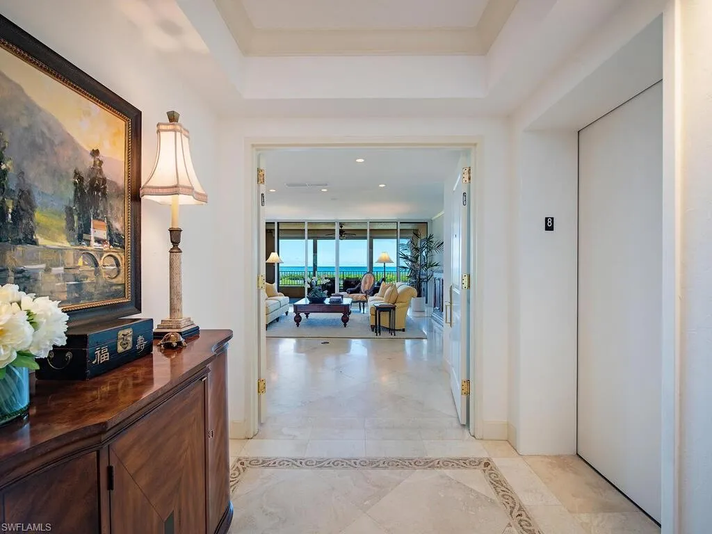 Experience the beauty and allure of this RARE Pelican Bay Cap Ferrat 8th floor 4 BEDROOM, 4 BATH+FAMILY ROOM+CABANA, 3650 air-conditioned square foot Gem, offering uninterrupted sweeping views of THE GULF, anchored by verdant tropical mangrove and palm canopy vistas. Your secure elevator sweeps you directly to your own private foyer, welcoming you to a marvelously generous open plan, designed to maximize and blend living/entertaining spaces with timeless sophistication, coupled by expansive Easterly and Westerly lanais and terraces inviting you to savor tropical Florida Gulf breezes, sunsets, sunrises, and serenity. A formal generous living room is wrapped in Gulf views, leading to a sun-lit morning room and well-equipped Chef’s kitchen, featuring handsome custom cabinetry, updated SS appliances, RARE natural gas cooktop, along with two Sub-Zero beverage drawers. The separate spacious family and dining rooms easily accommodate large family or friend gatherings. Four split bedrooms invite maximum privacy, with the Owner’s Suite bathing in GULF VIEWS, while also boasting both his and her separate baths and separate walk-in closets. This rare Gem also includes your own deeded personal poolside CABANA, featuring a gathering room, full bath, and private patio complete with personal gas BBQ grill station, located just steps from Cap Ferrat’s stunning expansive resort-style Saltwater pool and spa. Cap Ferrat is well recognized for its significant luxurious tower amenities. Owners enjoy their 24/7 attended security guard-gated entrance, 24/7 front-desk personnel, multiple grand social gathering areas, expansive fitness, personal men’s and women’s spa therapy rooms, along with two beautifully appointed guest suites. The under-tower garage offers owners two deeded side-by-side parking spaces, along with a community electric charging station. This tower is also prized for being just steps away from the Pelican Bay beach tram station, allowing one to easily access Pelican Bay’s myriad of private membership-included community and beachfront amenities: 2 private beachfront restaurants, attended beachfront services, attended fitness, learning center, 18 Har-Tru® tennis courts, pickleball park now in progress, plus miles of kayaking, biking, and walking paths. Ask about the never-ending Pelican Bay active social calendar, too! Artis Naples Performing Arts Center, upscale Waterside Shops, lively Mercato, and The Naples beachfront Ritz-Carlton Hotel all just moments away. This is your opportunity to live where refined elegance meets the exceptional lifestyle!