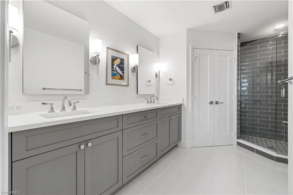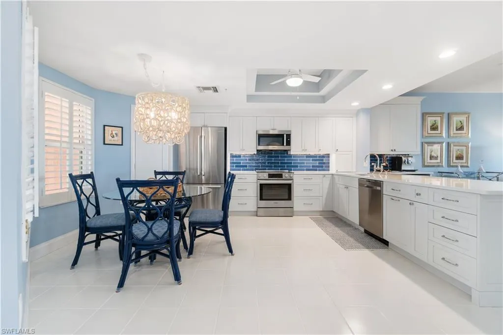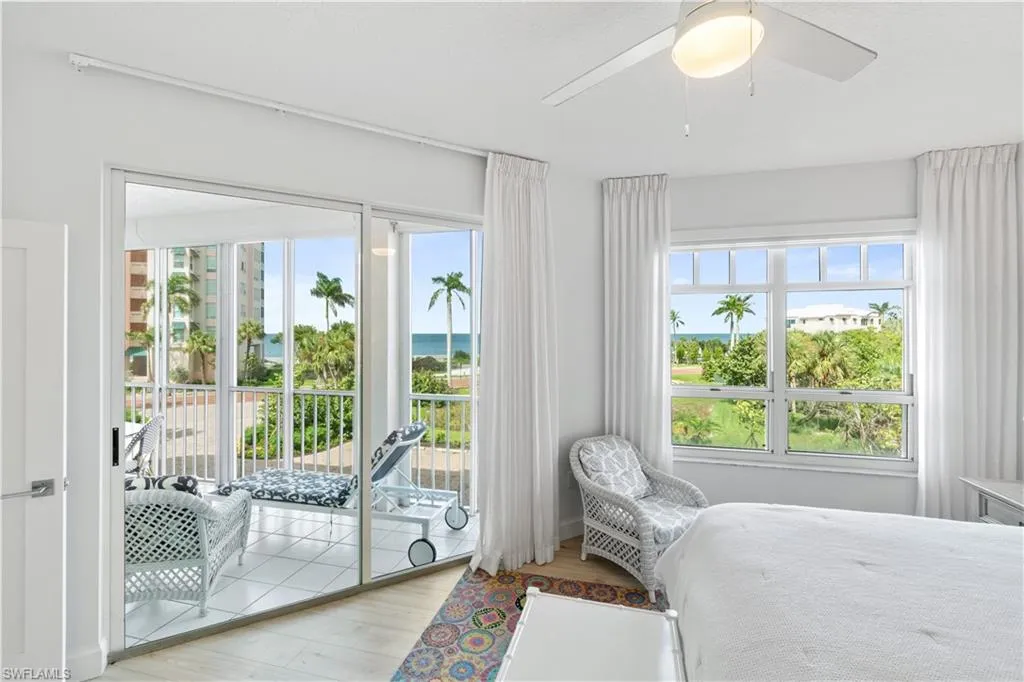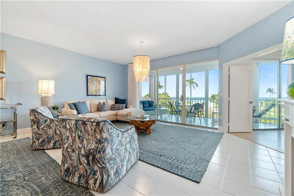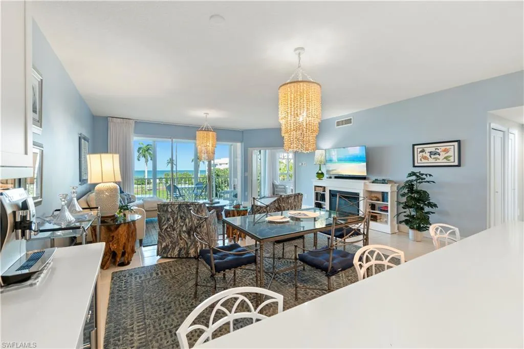 Beautifully renovated condo with spectacular Gulf views offered in coveted Barefoot Beach Club! Uniquely located in the only building on the bayside of Barefoot Beach with unobstructed Gulf views AND West-facing balconies for breathtaking sunsets over the Gulf of Mexico. This 2 bed/2 bath coastal delight features an open floor plan, electric storm shutters, and tile flooring. The screened-in lanai invites in the sound of the surf from the Gulf of Mexico and offers breathtaking sunsets from the comfort of your own home. The expansive chef’s kitchen offers white quartz countertops, white cabinetry, ocean blue tiled backsplash, high-end Bosch appliances, breakfast bar and has an open concept for endless Gulf views. Perfect for entertaining, this condo offers dual dining areas & an adjacent built-in bar with wine cooler. The spacious primary bedroom has breathtaking views of the Gulf, private entry to the lanai, an office nook, and a beautifully updated bathroom with dual vanities, a large closet, and a frameless glass shower enclosure with multiple showerheads. Nearby to the NEW CLUBHOUSE with state-of-the-art fitness center & resort-style pool. Barefoot Beach residents enjoy 3 miles of beach, 2 pools/spas, manned/gated entry & on-site mgmt. OPTIONAL “Club at Barefoot” offers, tennis, 2 restaurants & beachside food/bev/chair service. Excellent Collier County location minutes to Mercato, Waterside & easy access to RSW Airport.