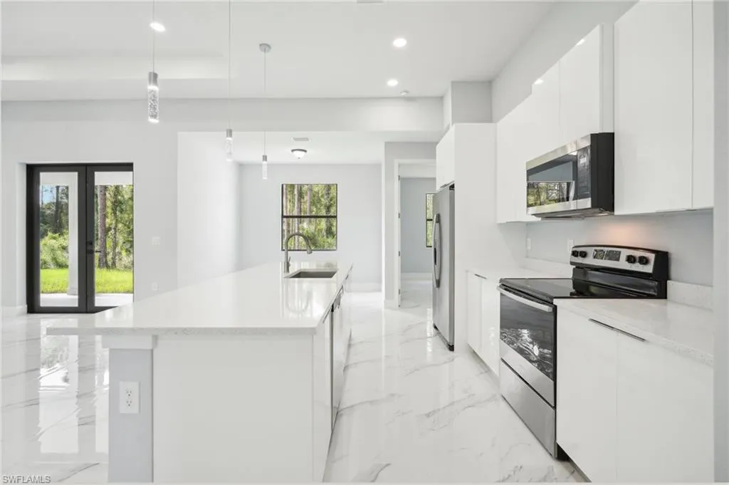 Welcome to YOUR brand new home with open floor plan that feels spacious from the moment you walk in thru the oversized French doors. Creating a perfect space for family and entertainment, the modern kitchen featuring a large waterfall island with stainless steel appliances, white cabinets and ample storage. This residence offers three bedrooms plus den, boasting three full baths and a two-car garage. Master suite features his/hers walk-in closets, dual sink, tub and shower. Prime location, minutes away from fine dining and shopping, also very close to the stunning beaches of Fort Myers.