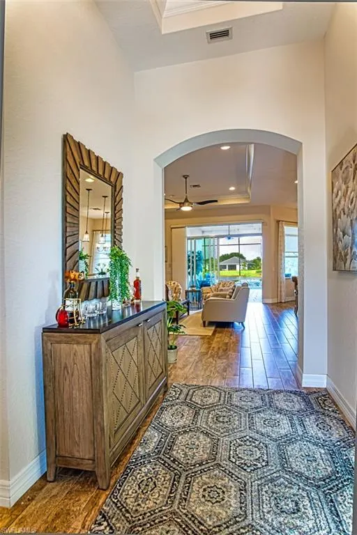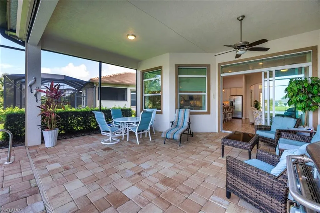 Welcome to a custom-built residence designed to capture the essence of Florida’s most enviable lifestyle—where elegance, comfort, and leisure converge in one of the most desirable golf communities in the state. If you’re searching for a medium-sized home that doesn’t compromise on luxury, look no further. This meticulously crafted home features refined finishes and thoughtful upgrades throughout. The gourmet kitchen is a chef’s dream, showcasing gleaming stainless-steel appliances, granite countertops, a custom glass tile backsplash, and rich crown molding that adds a sophisticated touch. Step inside to find an interior adorned with high-end designer fixtures, elegant window treatments, and tasteful accents that complement the spacious, open floor plan. The Great Room flows seamlessly into an extended screened lanai, creating a perfect blend of indoor and outdoor living. Step outside and indulge in your personal Florida paradise—an inground pool with a serene lake view, ideal for peaceful mornings or sunset entertaining. Set within a community known for championship golf, lush natural landscapes, and resort-style amenities, this home offers not just a place to live, but a way to live. Live in the Florida lifestyle you’ve dreamed of—refined, relaxed, and radiant. Enjoy two 18-hole championship golf courses, tennis courts, a state-of-the-art fitness center, resort-style community pool, pickleball, and bocce ball courts. Outdoor enthusiasts will love the miles of biking and walking trails, plus a dog park for your furry friends. Conveniently located near Downtown Fort Myers, the Caloosahatchee River, and both the Fort Myers and Punta Gorda Airports, this home truly has it all.