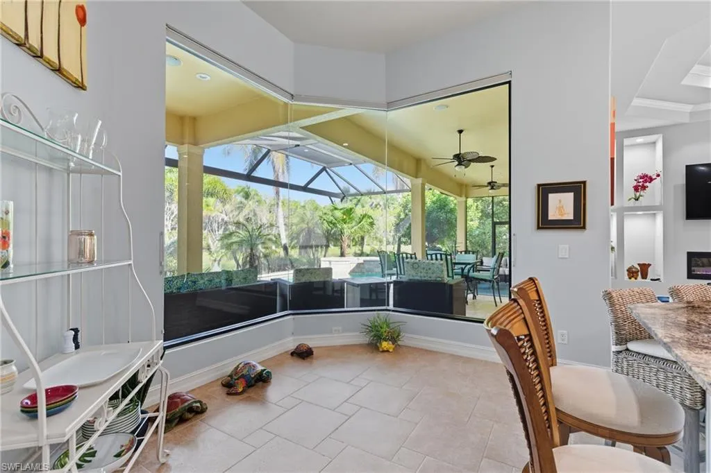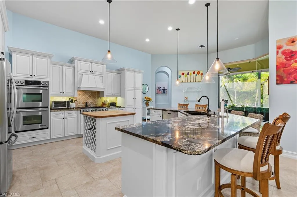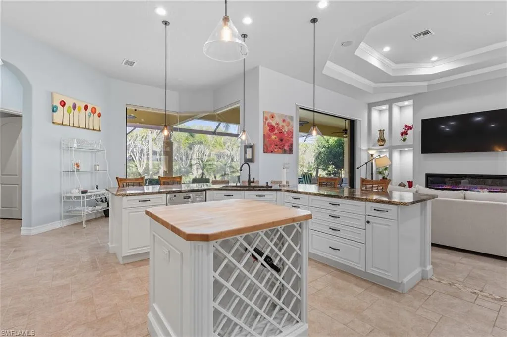 Highlights include a 3-car garage with generous storage, a chef’s kitchen featuring a Jenn-Air cooktop, double oven, and butcher-block island, plus a formal dining room complete with a built-in wine cooler—ideal for entertaining. The living room’s electric fireplace adds a cozy touch, while the screened lanai invites you to relax with a swim in the pool, unwind in the spa, or enjoy evenings grilling in the outdoor kitchen.